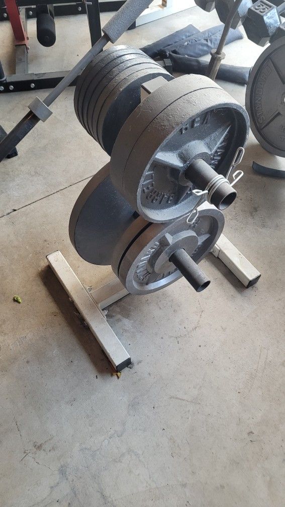 4) 45 lbs plates 4) 35 lbs plates 6) 25 lbs plates 8) 10 lbs plates 6) 5 lbs plates 2) 2.5 lbs plates 1) 45 lbs Olympic bar 1) 25 lbs Olympic curl bar 2) weight tree stands 2) squeeze weight locks All must be sold together, must pick up. You will need a truck!