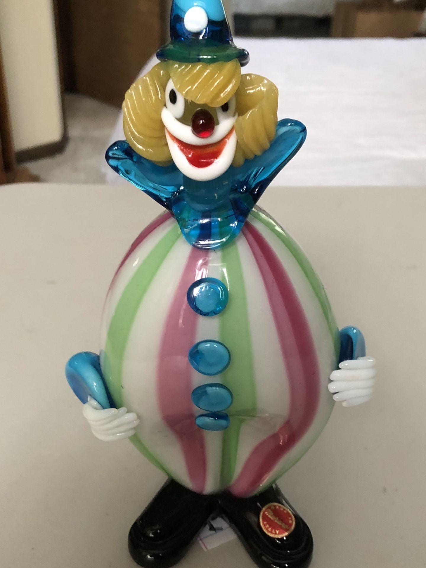 Pretty pink and light green striped Murano Glass Clown. About 9.5 inches tall. Sticker on left foot.
