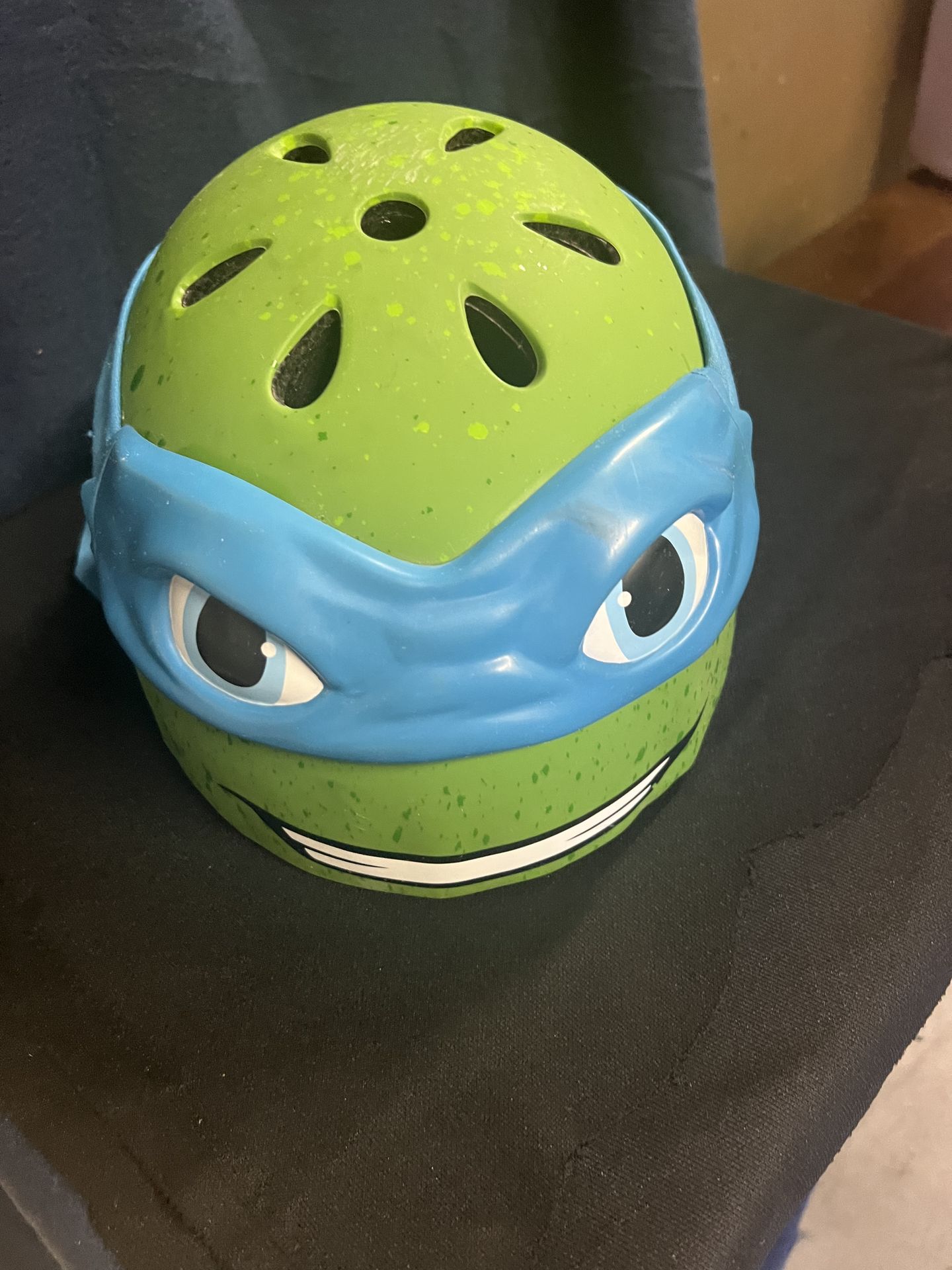 Cool green helmet with Leonardo from Teenage Mutant Ninja Turtles. Has blue mask and eyes. Good for bike or skate adventures.