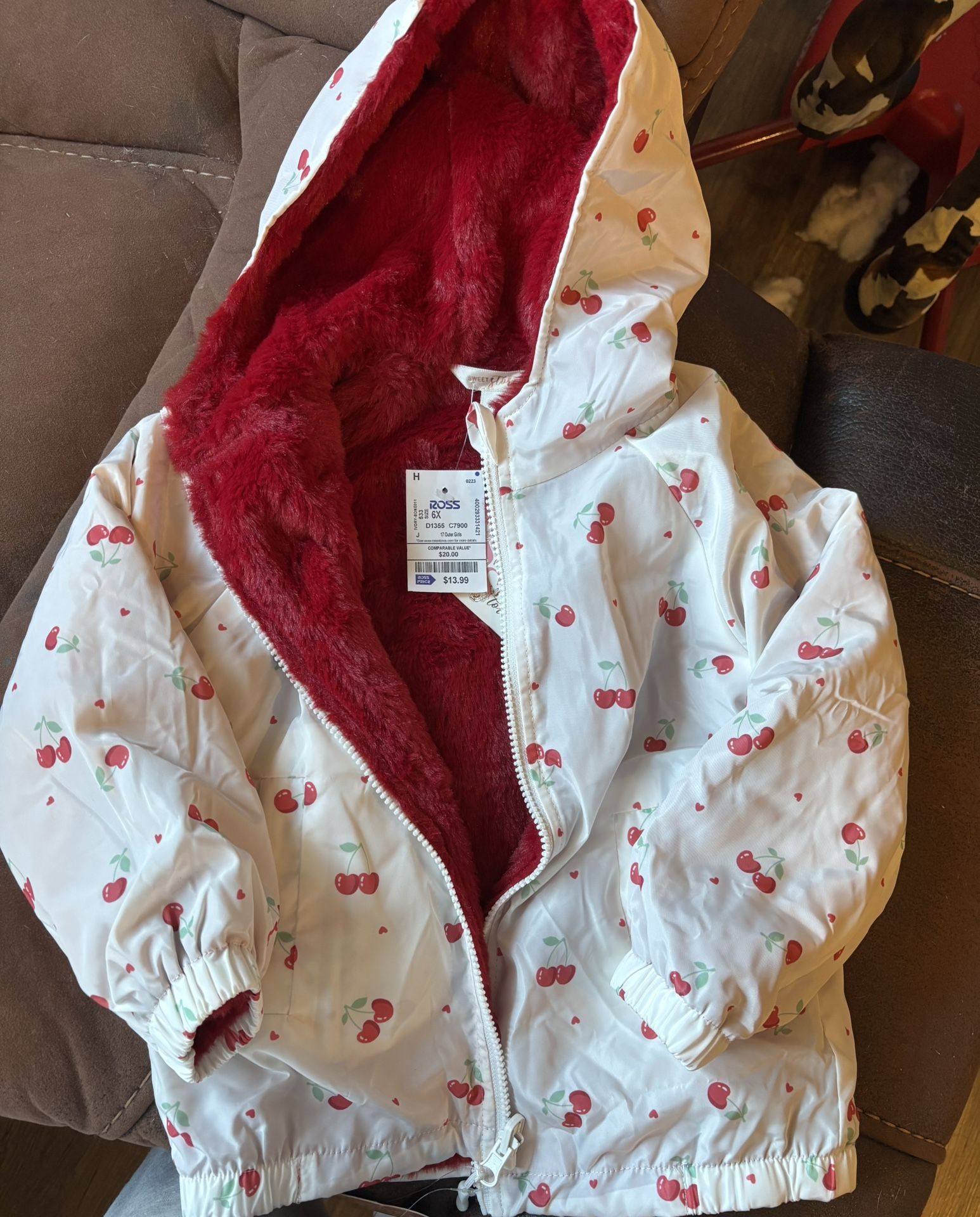 Cute cherry print jacket lined with red faux fur. Never worn. Size 6x in girls. Would like back what I paid for it but open to other offers
