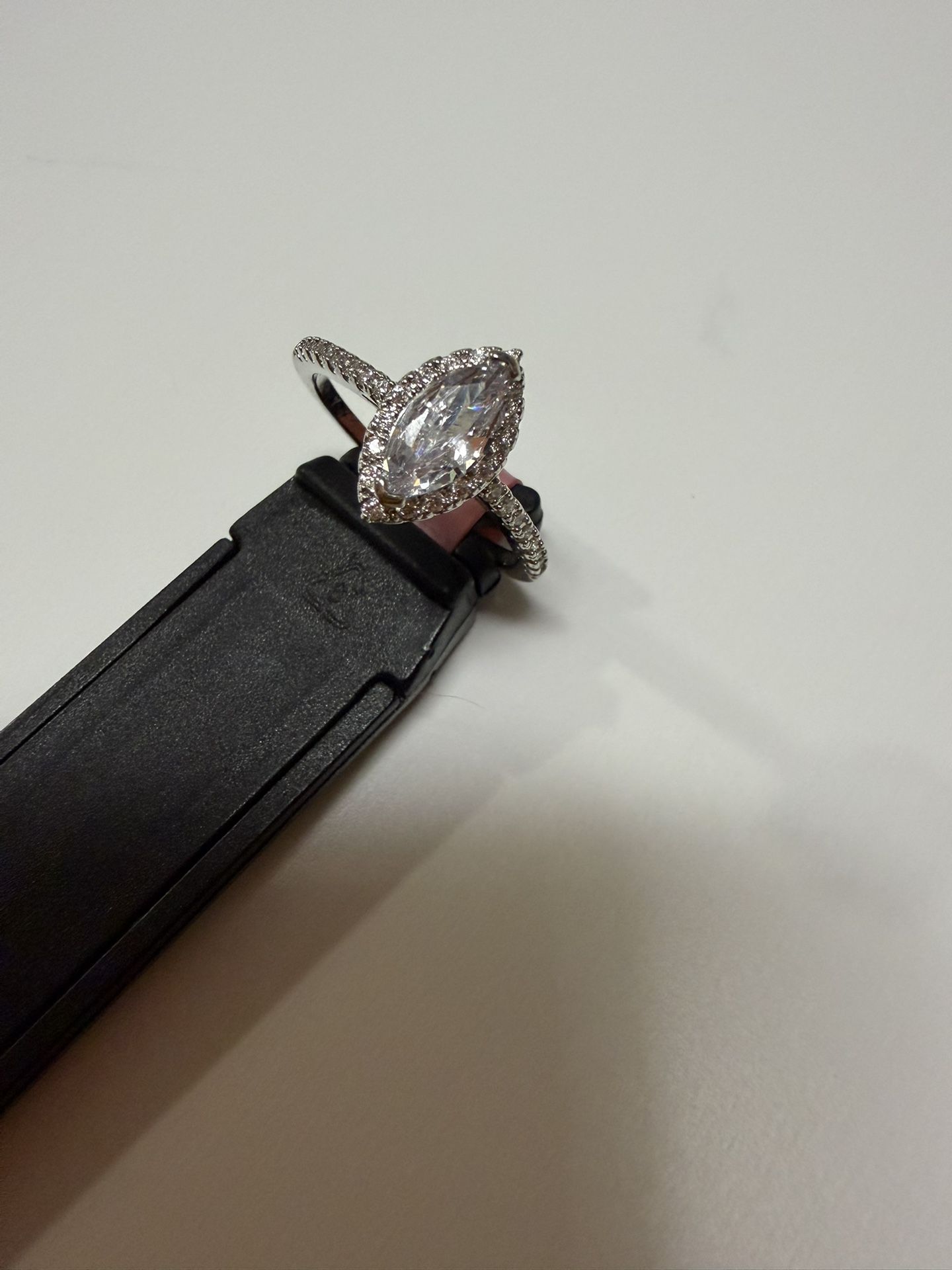 Beautiful marquise cut halo style ring in silver tone finish. Details: • Size 8 – 8.5 • Marquise shaped simulated center stone • Halo setting for added sparkle • Pave-style band • Silver tone metal finish This is a fashion ring (not solid gold or natural diamond). Great for everyday wear, travel, or as a statement piece. Condition: Good overall condition. Please see photos for details.