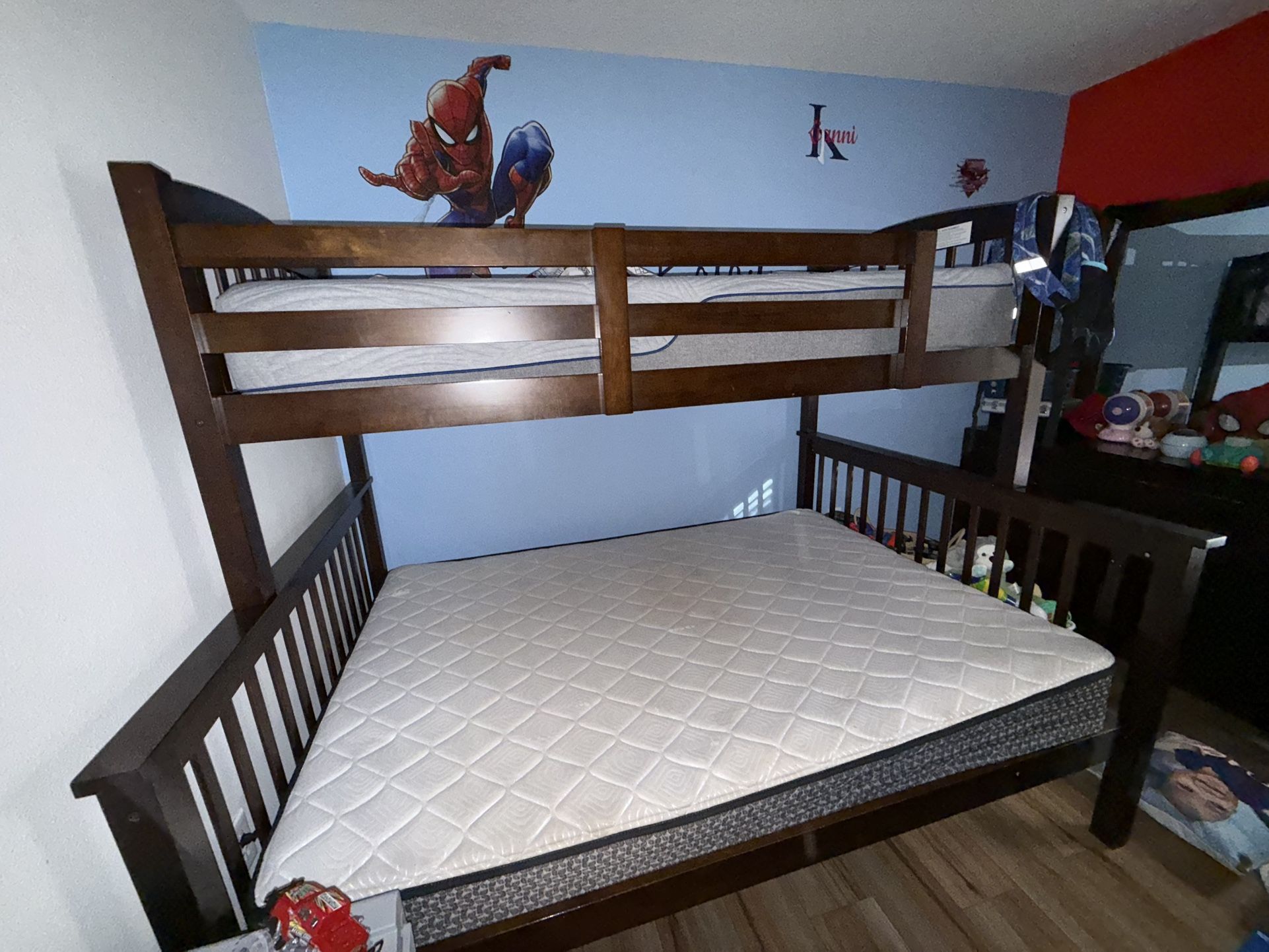 Full size bunk bed with twin on top. Brand new twin mattress on top tempur-pedic . Can replace or clean full and add mattress cover.