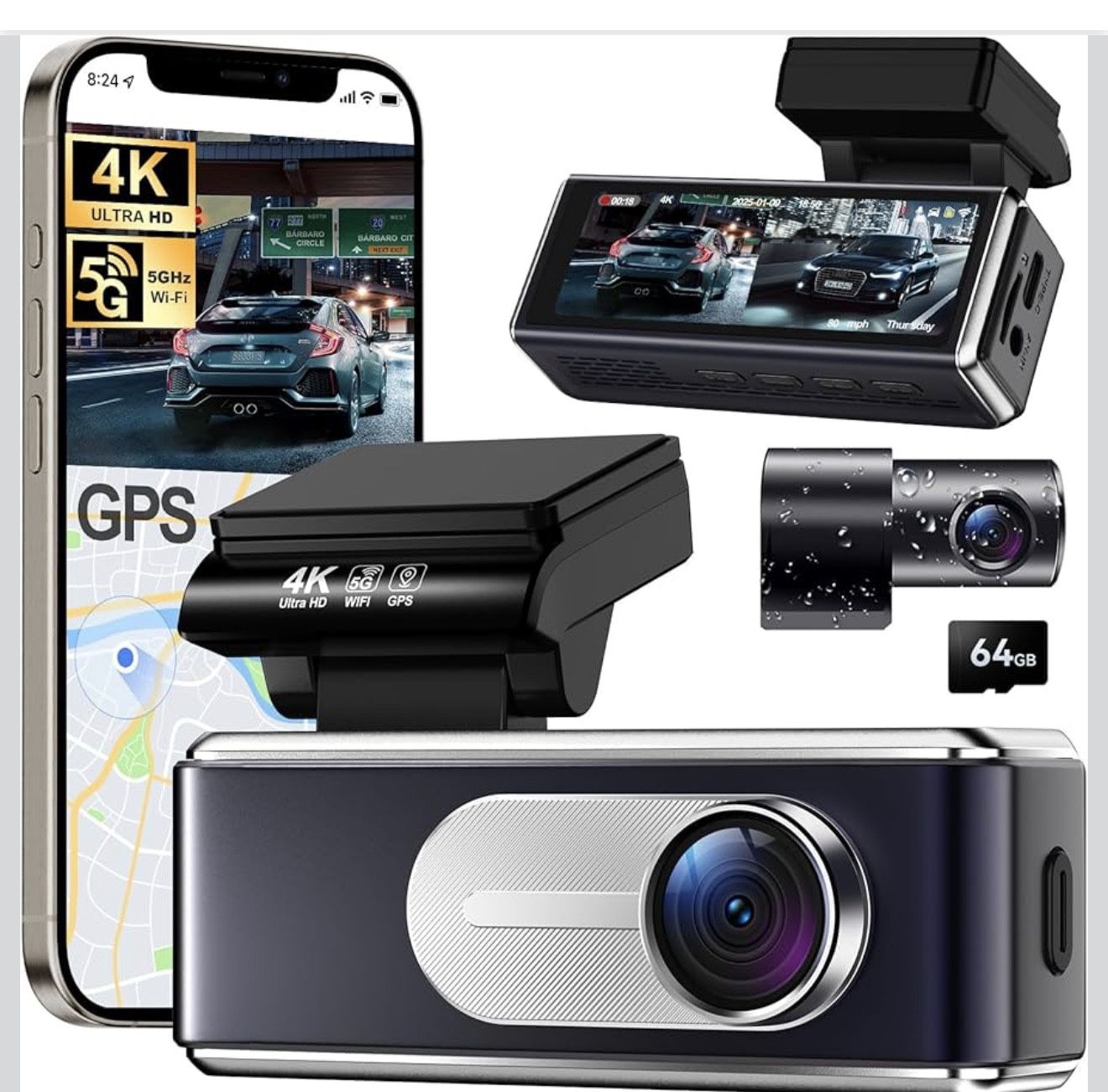 New, never used Dash Cam Front and Rear - 4K HD Dual Dash Camera for Cars, Built-in 5G WiFi GPS, 64GB Card, Dashcam with 3.2" IPS Screen, UHD Night Vision, HDR, App Control, 24H Parking Monitor