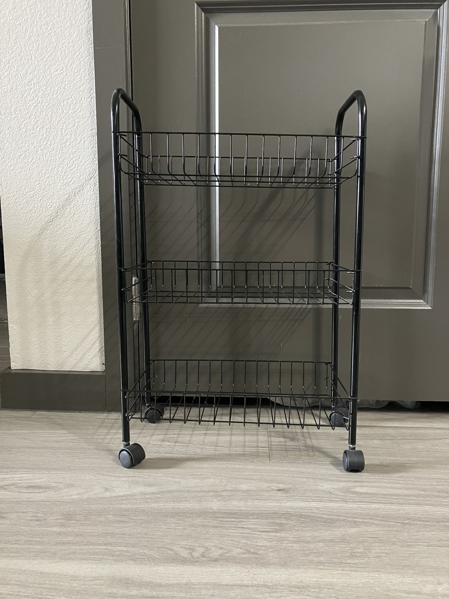 Black wire cart on wheels with 3 shelves Target $16.99 Delivery available depending on location Details: Slim design makes it perfect for space saving storage between the washer and dryer Rolling cart has 3 basket type storage shelves The smooth, rolling casters enable you to move the cart almost effortlessly from room to room Assembled Dimensions: 10.0 L x 17.5 W x 24.75 W inches Made of a durable epoxy coated steel Assembles in minutes with no tools required Easy to clean, just wipe with a damp cloth and towel dry Description: Lack counter or cabinet space but still need room to store things? Whitmor’s Slim Household Cart is the perfect solution for your laundry room, bathroom or office. This is a great storage and organization solution for storing all your cleaning, laundry, and bathroom needs in a small space. Three wire shelves provide ample storing and organizing space. The three wire shelves are basket shape to provide ample storage space and do not allow items to fall off. Wheels roll with ease but also lock in place for stationary use. Constructed of white epoxy coated metal, this cart is built for durability and space efficiency. Easy to care for, just wipe with a clean damp cloth to keep it looking as good as new for years to come. Assembles in minutes with no tools required. Assembled Dimensions: 10.0 L x 17.5 W x 24.75 H inches. Whitmor is a 4th generation family-owned and operated business. Since 1946, Whitmor has been dedicated to bringing organization home by creating products that simplify everyday life. Ensuring that those products are built with integrity, value, and innovation is our commitment to you. And our promise is that we will always be here for you should you ever need us as we stand behind our product 100%. Whitmor customer service is available in English and Spanish Monday through Friday from 8 am - 4:30 pm CST. Call us and we will gladly assist you in your language. You may contact Whitmor toll-free at (contact info removed) or via email at (contact info removed). https://offerup.com/redirect/?o=aHR0cHM6Ly93d3cudGFyZ2V0LmNvbS9wL3doaXRtb3Itc21hbGwtaG91c2Vob2xkLWNhcnQtd2hpdGUvLS9BLTg2OTEzMjYxI2xuaz1zYW1ldGFi