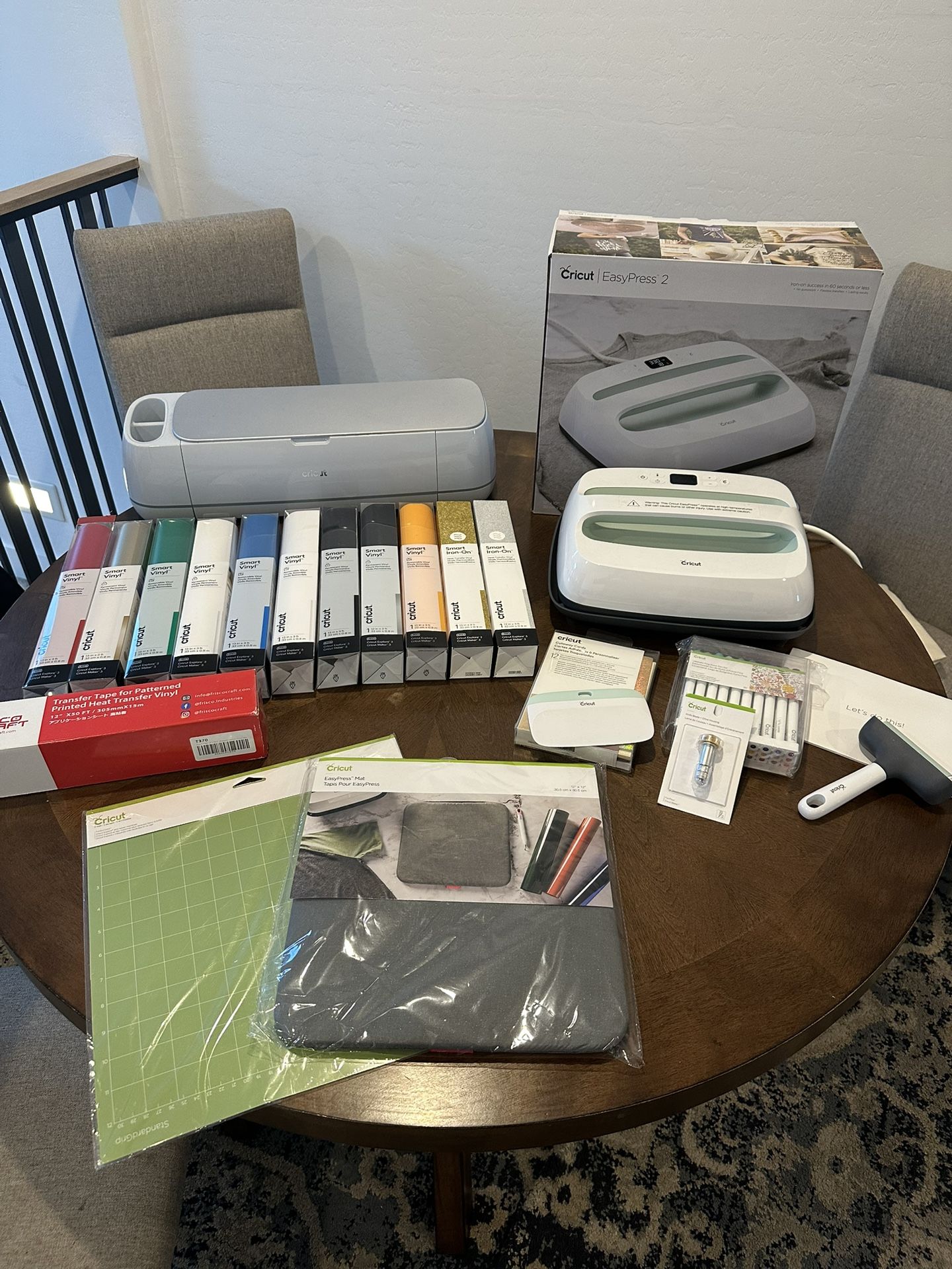 This is a package set of the dry cut maker three and the cry cut easy press two along with 11 cartridges of smart vinyl 12 cut away cards a set of 36 fine tipped markers a cry, cut roller, a cry, cut knife blade a easy press mat and standard grip mat as well as transfer tape. My wife doesn’t have time to start crafting business she had her heart set on. Over $900 was spent on everything here.