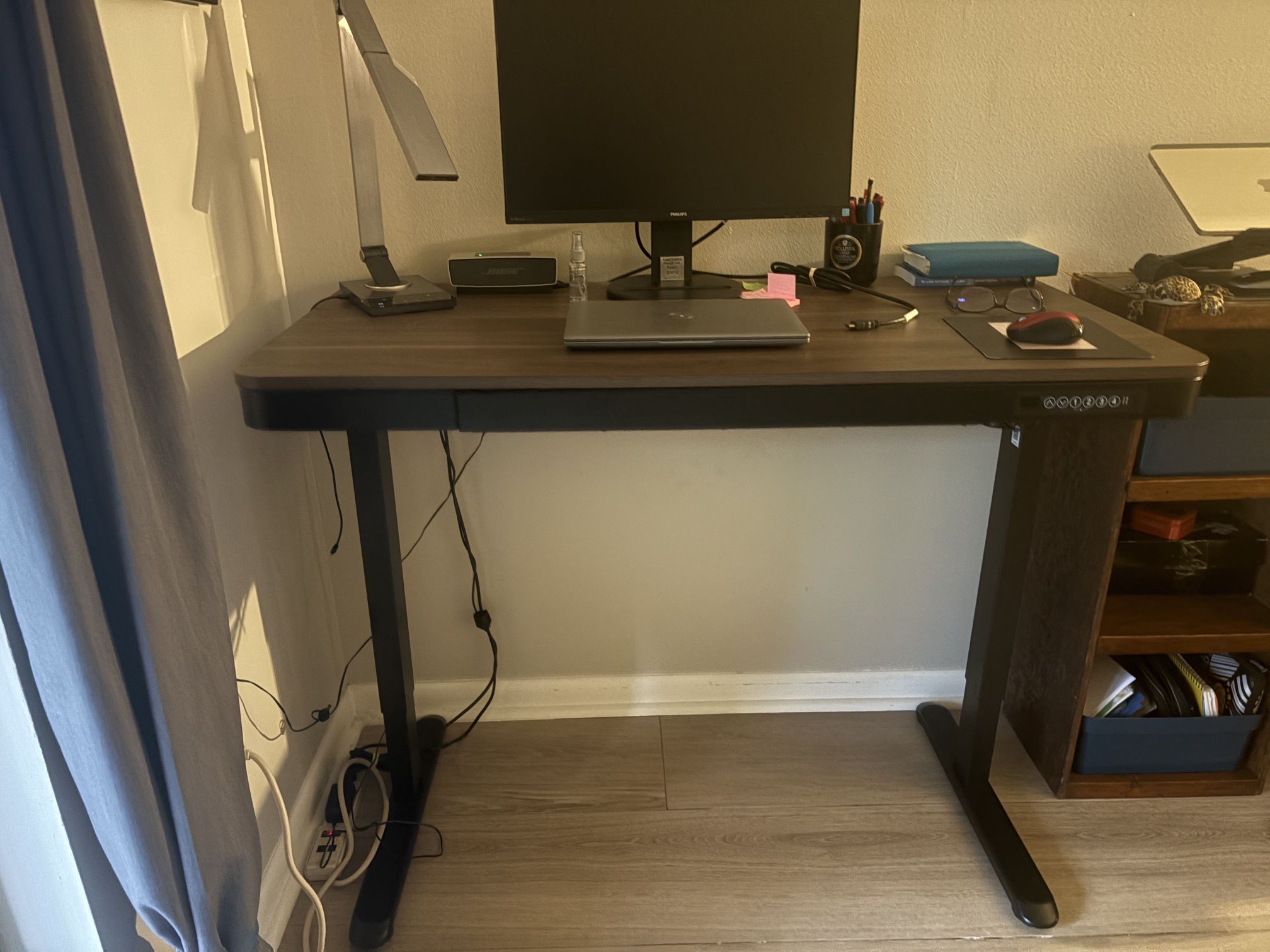 FLEXISPOT Comhar Electric Standing Desk with Storage. Fully electric with one drawer and built-in charging outlets. One year old. Great condition. Original price $288. Desktop is 47.5 x 24 inches and height can be anything between 46.5 and 29 inches.