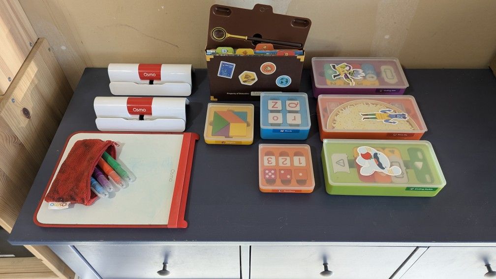 Includes two bases, Osmo Town detective, dry erase board and markers, numbers kit, tangram kit, words kit, Coding Jam, Pizza Co., and Coding Awbie.
