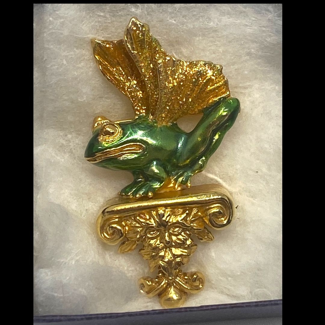 Rare Vintage Kirks Folly Whimsical Frog Brooch Pin Green Enamel Gold-tone