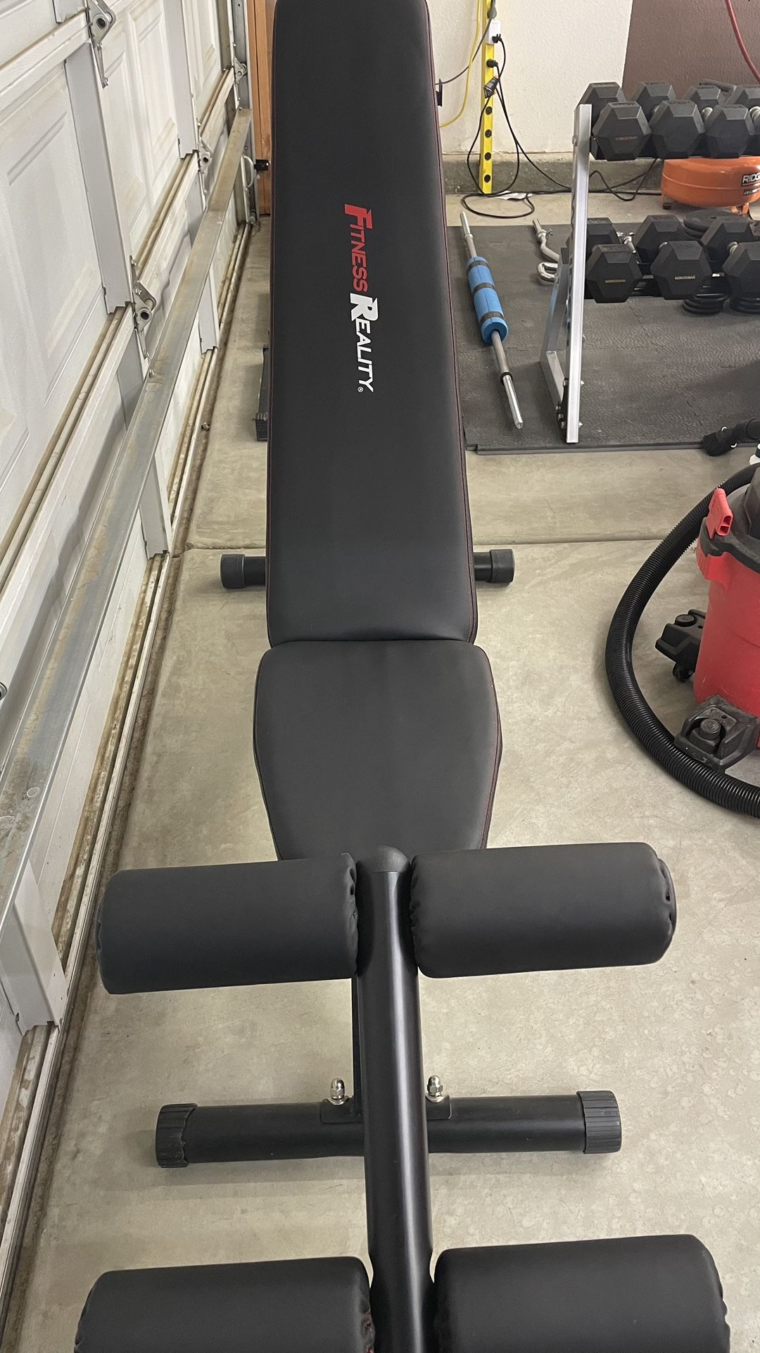 Fitness Reality 2000 Super Max XL. Adjustable weight/fitness bench. Incline and decline. Seat also adjusts upward. Currently listed on Amazon for $225 new.