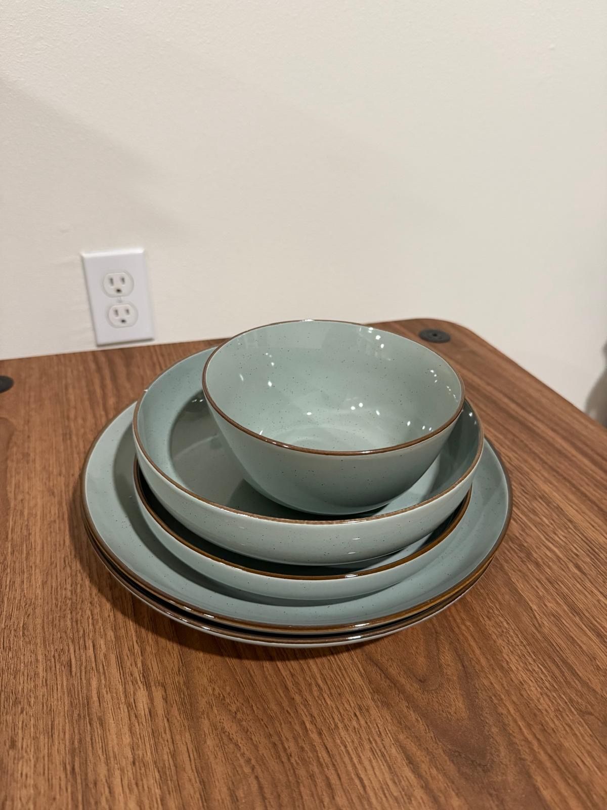Sage Green Stoneware Dinnerware Set – 16 Piece Place Setting (Speckled, Rustic Rim)
