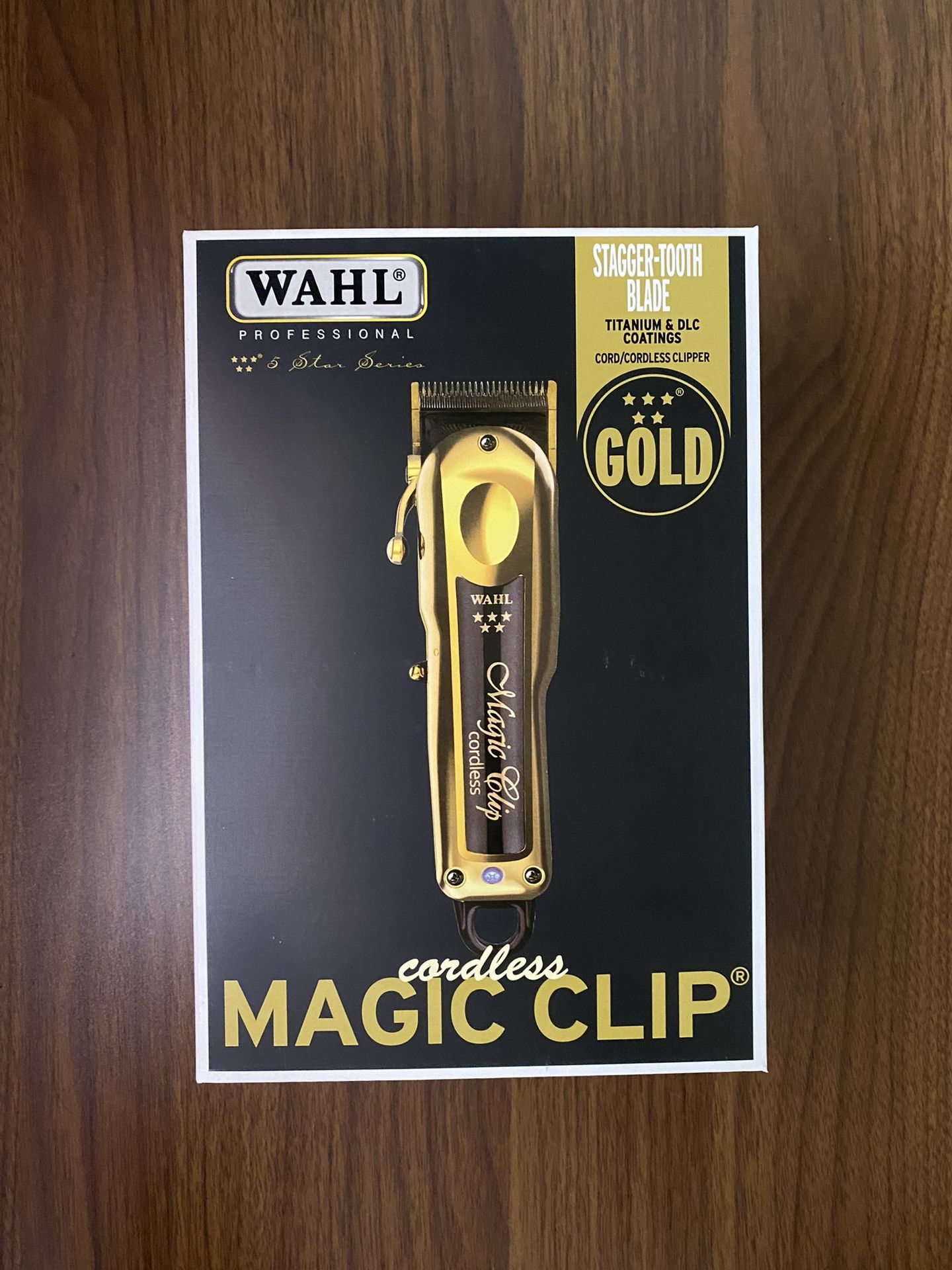The Gold Magic Clip wireless clipper is lightweight and features the patented stagger-tooth blade which is designed for creating seamless blends while hard or soft line fading. Uses an even stronger motor to cut through thick and textured hair smoothly and easily The magic is in the blade! The stagger-tooth blade has titanium and DLC coatings that make blades extremely strong, corrosion resistant, and lower blade temperatues while in use delivering the highest performance The American-made professional wireless hair clipper uses crunch blade technology designed to make a crisp, crunch sound when cutting, helping barbers and stylists know when their blend has been perfected. Is highly durable and features a metal taper lever It has a run time of 100+ minutes with a Smart LED charge system. It includes 8 patented premium cutting guides, a weighted, space-saving gold and black charge stand, styling comb, cleaning brush, clipper blade oil, and operating instructions