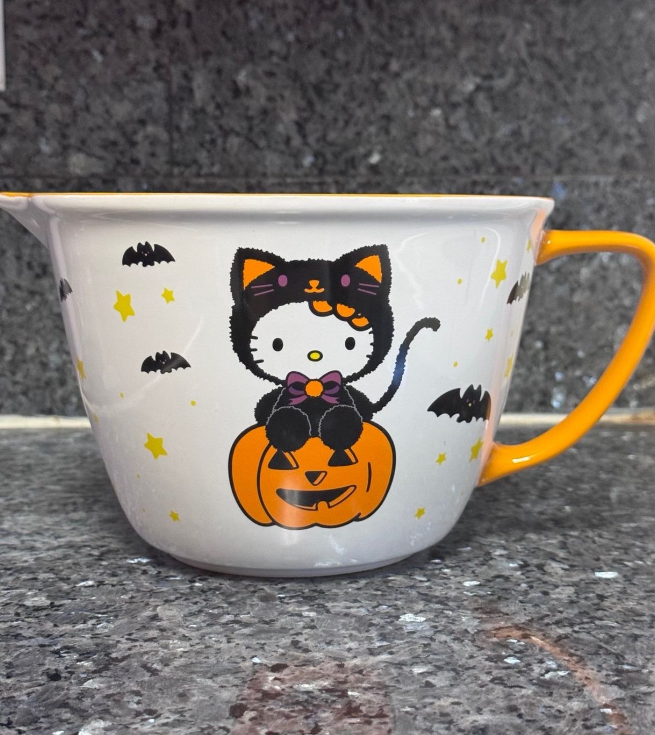 Halloween Hello Kitty Wearing Black Cat Costume Sitting On An Orange Pumpkin Orange / White Mixing Bowl - Brand New! - BNWT! (Bought New With Tags!) - Limited Edition! - Has orange handle with Halloween themed Hello Kitty and bats and little stars as a design! - Dishwasher and Microwave Safe! - Official Hello Kitty Merch! - Quick and experienced shipper! - Extremely cute for Halloween! - Perfect to give as a gift to Hello Kitty collector! - Perfect to add to a Hello Kitty collection! - Perfect to have as a cute decoration or to use them! - Please feel free to ask any questions, send an offer, or bundle with any other items! :))