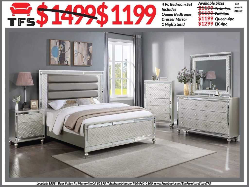 4pc Bedroom Set Queen $1199 4pc Includes bedframe Dresser mirror nightstand Silver Mirrored Bedroom Set Eastern king $1299 4pc Includes bedframe Dresser mirror nightstand Silver Mirrored Bedroom Set VISIT US TODAY THE FURNITURE STORE 15584 BEAR VALLEY RD VICTORVILLE CA 92395 OPEN 7 DAYS A WEEK 10AM-6PM FINANCING AVAILABLE NO CREDIT NEEDED 90 DAYS OR 100 DAYS 0% INTEREST DELIVERY AVAILABLE IF NEEDED RESTRICTIONS APPLY: Prices are Subjected To Change Without Notice