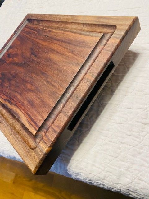 Figured black walnut slab. 12 1/2” deep x 15 1/5” wide 1 1/2” thick with juice grove and finger wells. $120