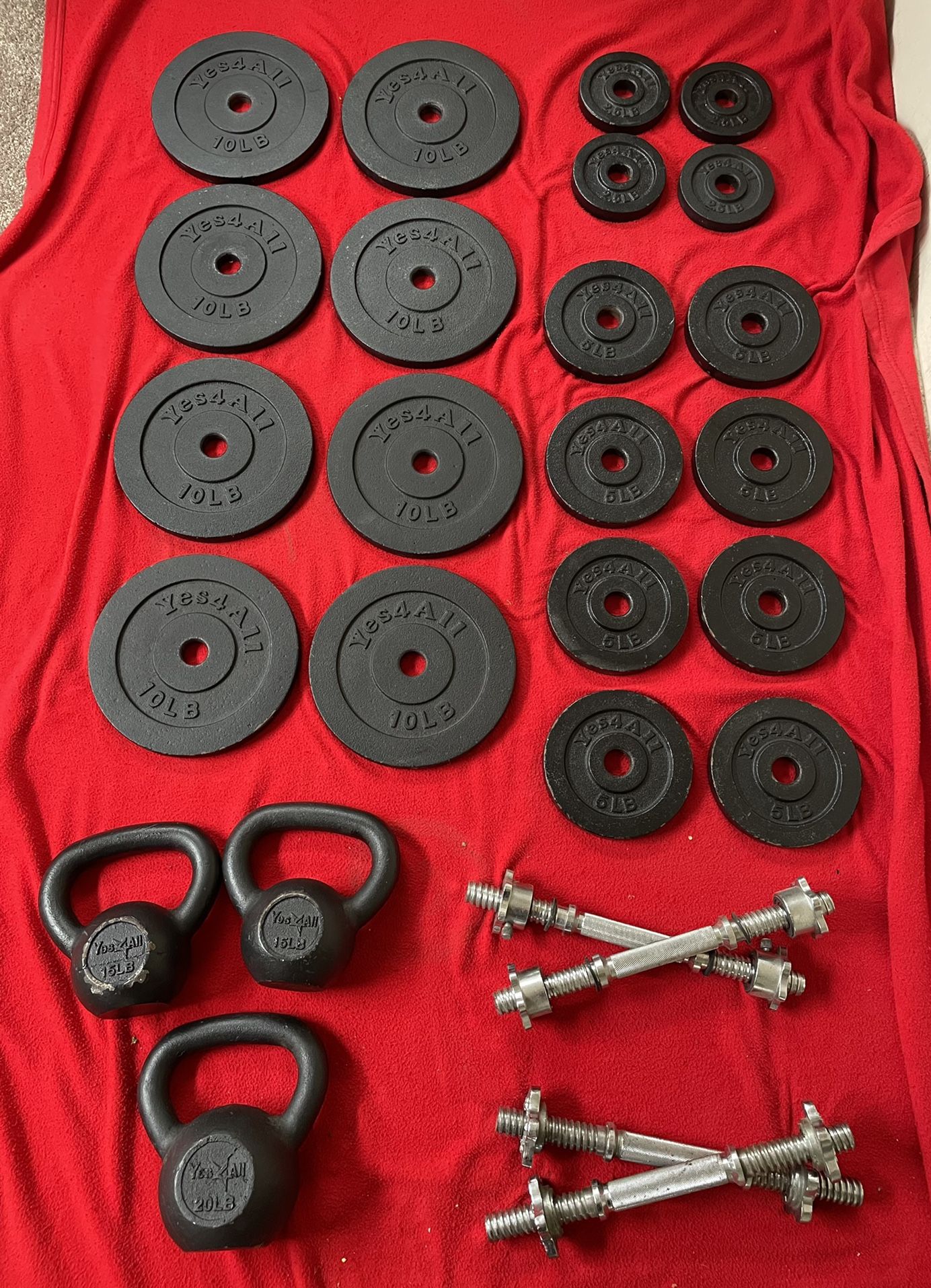 Weight Plates: 10’s - 14 pieces (140 lbs) 5’s - 8 pieces (40 lbs) 2.5’s - 4 pieces (10 lbs) WEIGHT: 190lbs PRICE: $1.50/lb, or $250 for all 26 pieces Kettlebells: 15’s - 2 pieces (30lbs) 20lb - 1 piece (20lbs) WEIGHT: 50lbs PRICE: $1.50/lb, or $60 for all 3 4 Iron Dumbbell Handles: PRICE: $40 for all 4 Medicine ball: 30lb - 1 piece PRICE: $40 Workout Bench, Adjustable (Flat, Decline, Incline): PRICE: $80 Message me if you’re interested in some or all of the items!