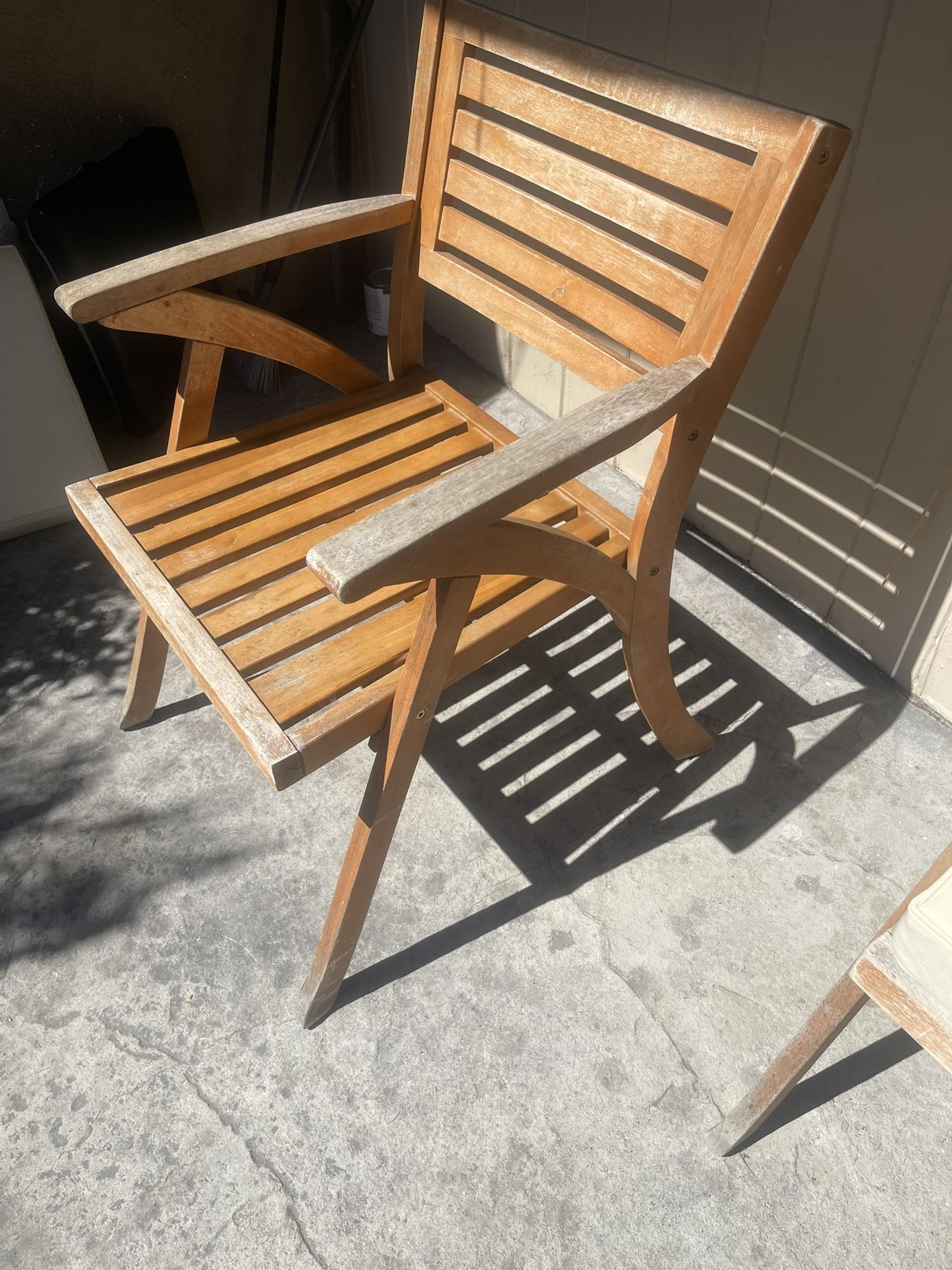 Set of 2 Teak outdoor patio chairs Need recoat to make them look like new again. Sell as is or if interested and need me to recoat I can do that as well. I plan on recoating them next weekend March 21st