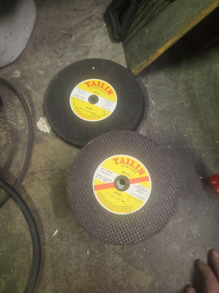 Tailin Metal Cutting Discs All Never Used $2 per disc any size or take all 178 discs for $120 Sizes: Box of 100 @ 7" x 1/8" x 5/8" Box of 20 x 3 (60 discs total)@ 10" x 1/8" x 5/8" 8 out of Box @ 10" x 1/8" x 5/8" 50 out of box @ 7" x 1/8" x 5/8"