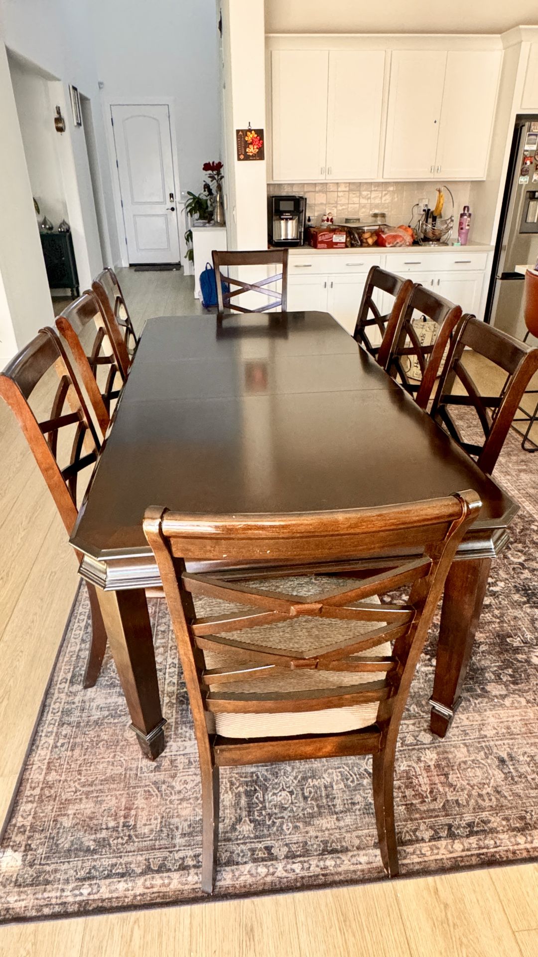 ITEM DETAILS Beautiful Ashley Furniture dining table with 8 matching chairs in excellent, pristine condition. This versatile set features a convenient leaf system that transforms it from an intimate 6-seater to a spacious 8-seater dining setup. ━━━━━━━━━━━━━━━━━━━━━━━━━━━━━━━━━━━━━━━━━━━━━━━━━━━━━━━━━━━━ SPECIFICATIONS TABLE DIMENSIONS: • 6-Seater (leaf removed): 69.5" L x 40" W • 8-Seater (leaf inserted): 88" L x 40" W • Sleek charcoal/metallic finish with chrome accents CHAIRS: • 8 matching dining chairs • 4 upholstered chairs with neutral cushioned seats • 4 wooden X-back design chairs • Mixed seating adds visual interest and comfort ━━━━━━━━━━━━━━━━━━━━━━━━━━━━━━━━━━━━━━━━━━━━━━━━━━━━━━━━━━━━ CONDITION & QUALITY • Pristine condition throughout • Table surface shows excellent finish with minimal wear • All chairs are sturdy and well-maintained • Extends smoothly with quality leaf mechanism • Perfect for families or entertaining ━━━━━━━━━━━━━━━━━━━━━━━━━━━━━━━━━━━━━━━━━━━━━━━━━━━━━━━━━━━━ PERFECT FOR: ✓ Family dinners and entertaining ✓ Transitional or modern home decor ✓ Flexible hosting - seats 6 or 8 people ✓ Contemporary kitchen and dining areas ✓ Quality Ashley Furniture construction ━━━━━━━━━━━━━━━━━━━━━━━━━━━━━━━━━━━━━━━━━━━━━━━━━━━━━━━━━━━━ WHY THIS SET? Ashley Furniture is known for quality construction and style. This dining set combines functionality with contemporary design, featuring a striking metallic table surface and complementary wooden chairs. The leaf system provides flexibility for both daily use and special occasions. ━━━━━━━━━━━━━━━━━━━━━━━━━━━━━━━━━━━━━━━━━━━━━━━━━━━━━━━━━━━━ CONDITION SUMMARY Brand: Ashley Furniture Condition: Pristine / Like New Seating Capacity: 6-8 people Set Includes: Table with leaf + 8 chairs = 10 items ━━━━━━━━━━━━━━━━━━━━━━━━━━━━━━━━━━━━━━━━━━━━━━━━━━━━━━━━━━━━ **SERIOUS INQUIRIES WELCOME • LOCAL PICKUP AVAILABLE** Contact me for more details or measurements.