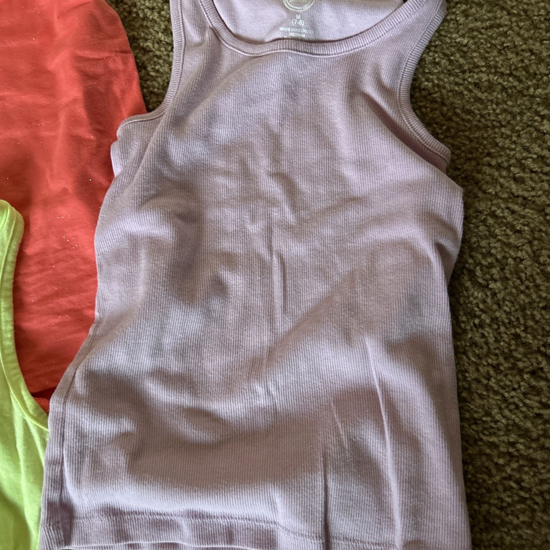 All size 7-8 girls tank tops and a pair of shorts from target. My daughter only wore them twice and outgrew it all so they are practically new and in mint condition. Asking for $20 for the whole bundle or willing to sell separate as well