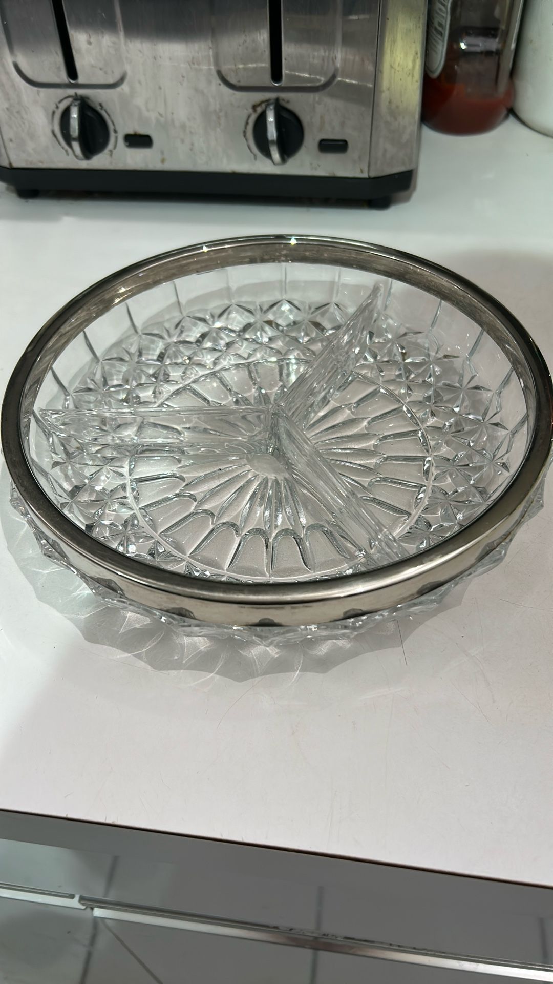 Glass three section divided relish dish with silver plated rim. Has small dent on the rim which is pictured. Other than that in great condition. 8.5 inches diameter.