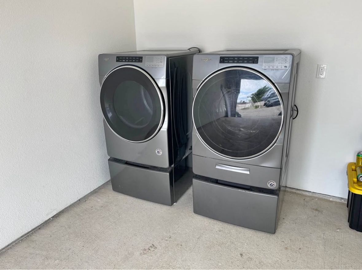 Selling a Whirlpool front-load washer and dryer set with matching storage pedestals. These units are just over 1 years old but still run solid, zero issues, no repairs needed, cleaned out.