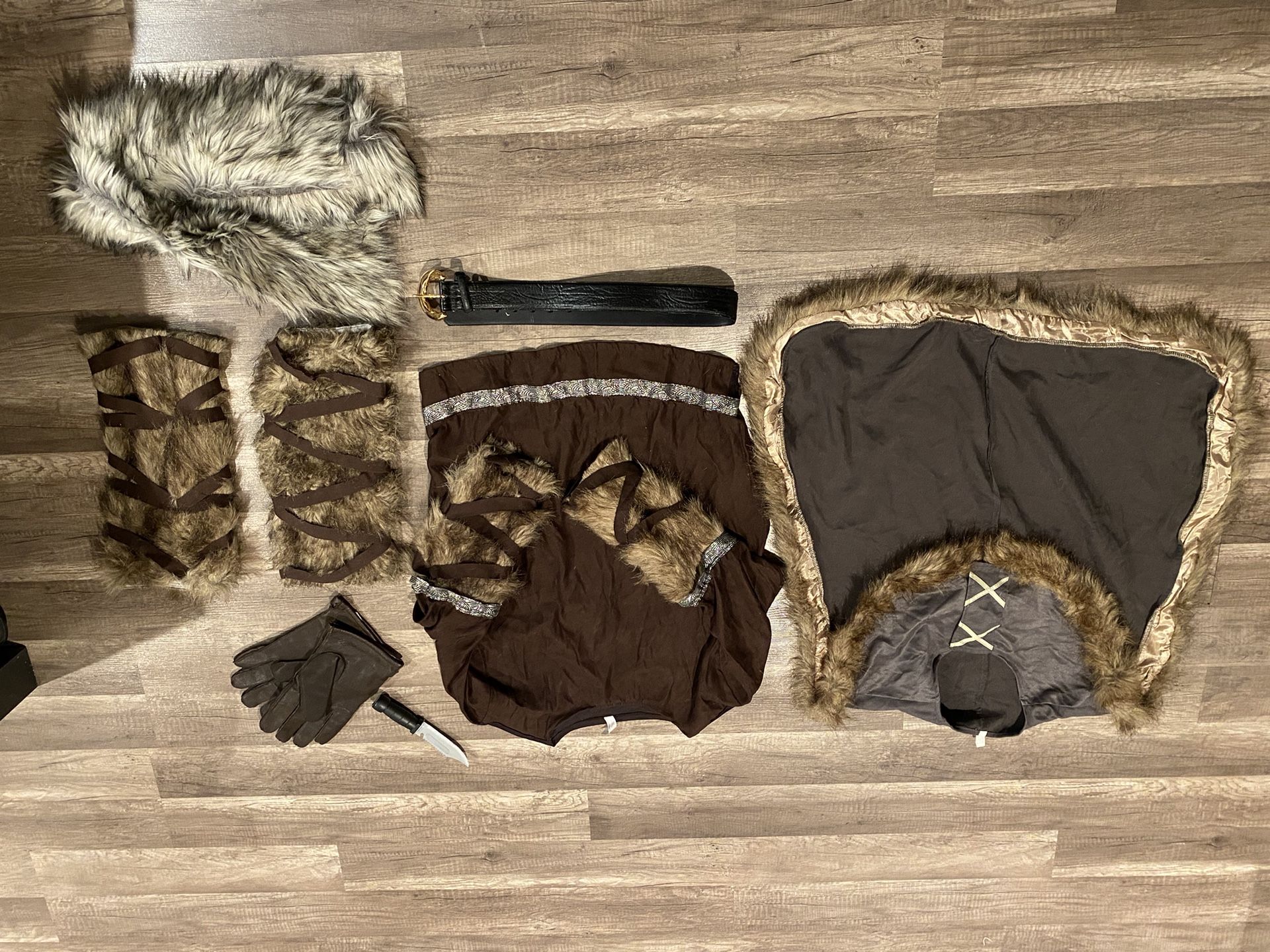 This has a cape, tunic, covering for shoes, gloves, belt, extra fur for whatever, plastic knife… My daughter wore these things as an 11 year old… although they could probably fit a 13/14 year old too. I would say Adult small?