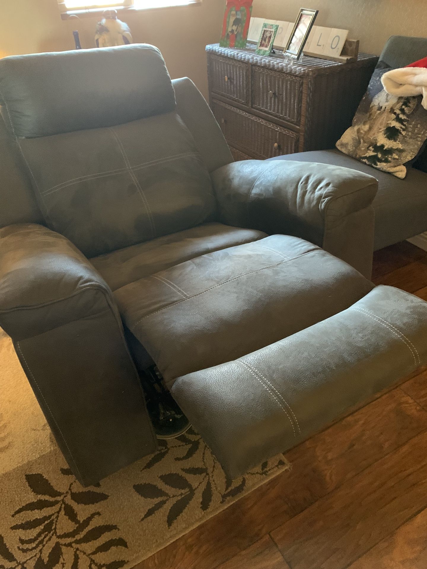 Recliner is gray microfiber. 41” wide X 31” deep.