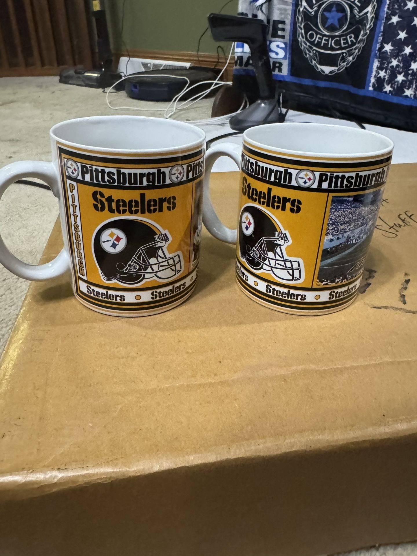 Lot of two breaking through from Pittsburgh Steelers game day mugs The Danbury mint NFL Carefully inspected by Mary Ellen authentication paper Box is included. In perfect condition.
