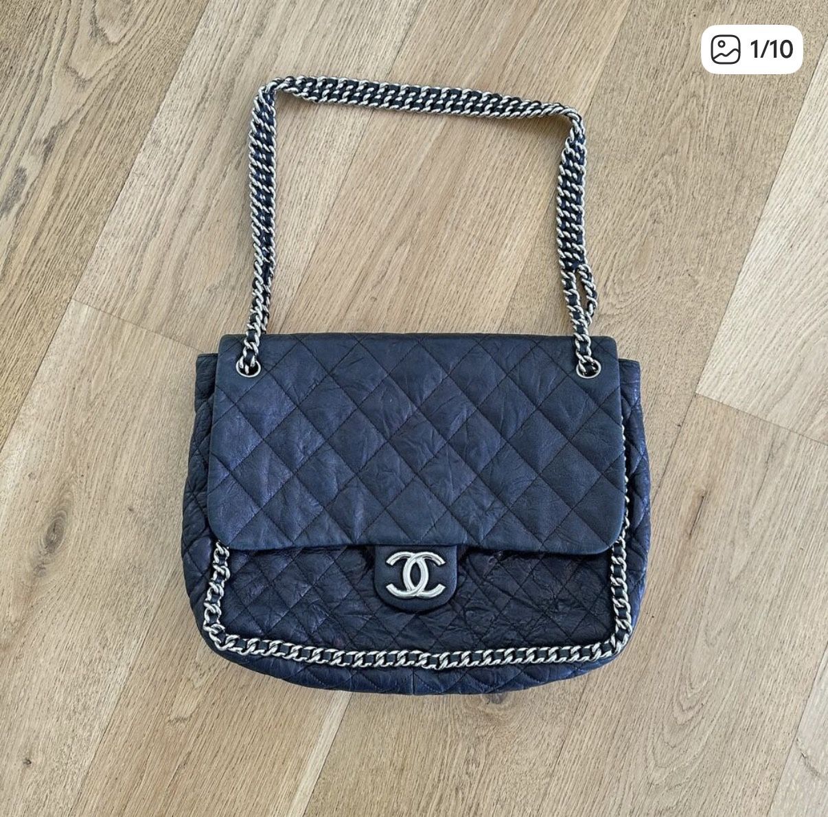 Chanel Quilted Leather Chain Maxi Bag In Black And Silver