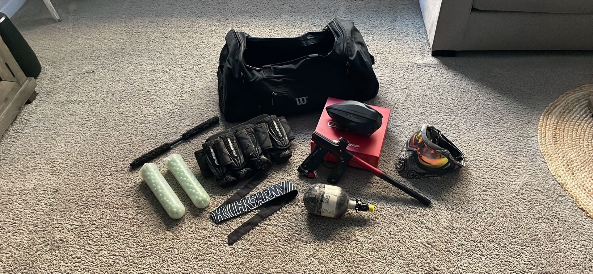 Full setup. Everything you need to get started, all works great. Comes with: Empire mini Ninja peanut tank Spire R2 hopper V-Force mask HK head band HK pod pack w/ 2 pods Barrel swab And carry bag ***SOLD AS A SET ONLY*** Fresh batteries in everything
