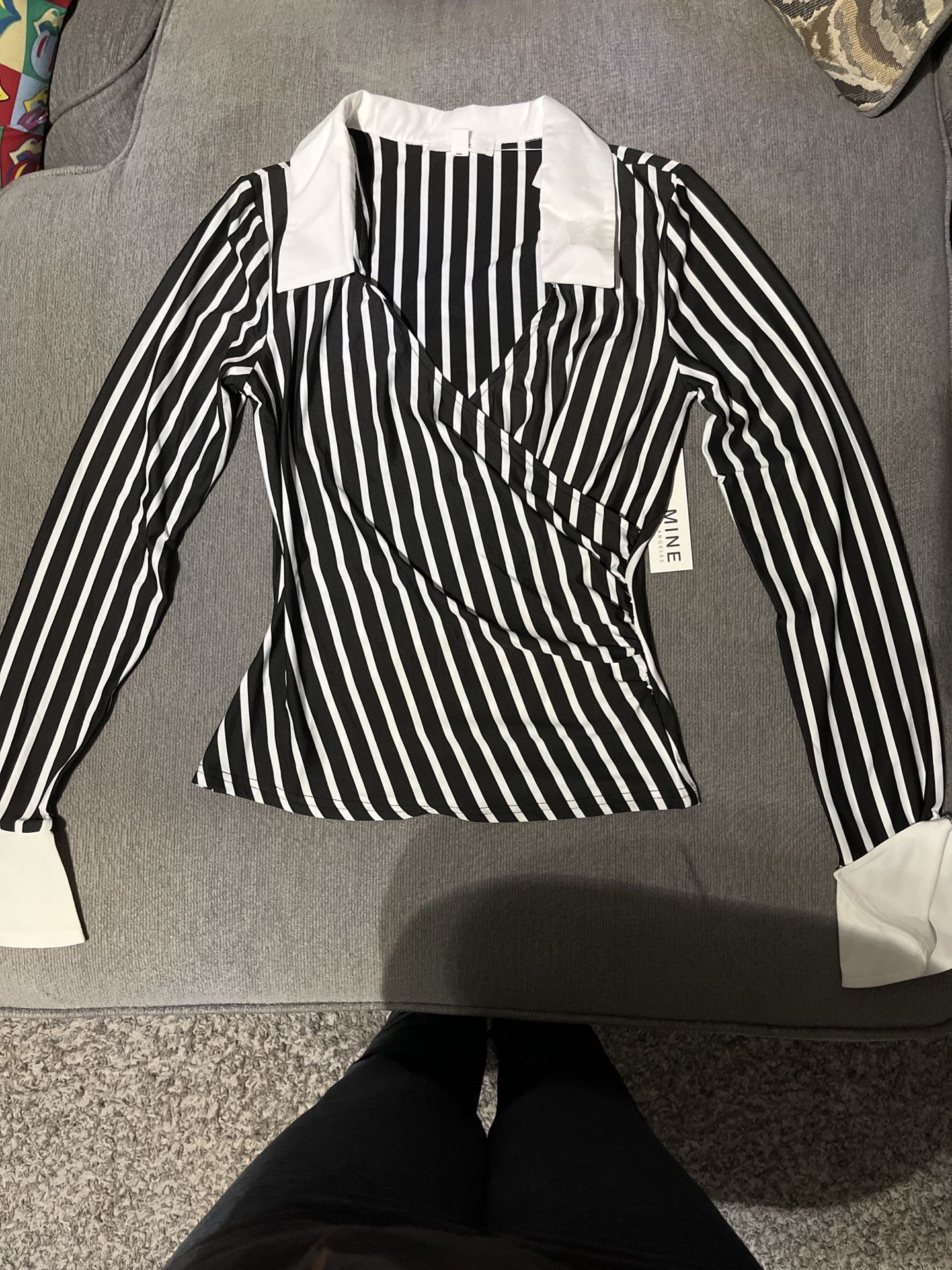 Brand new black and white striped wrap blouse with a flattering fitted design. Features a stylish collar, long sleeves with white cuffs, and a sleek silhouette that hugs the waist perfectly. Perfect for: • Work / business casual outfits • Date nights or going out • Dressing up with heels or keeping it casual Lightweight, comfortable, and super versatile. Condition: New with tags Size: Medium 💥 Clean, classy, and stands out without trying too hard. Pick up, meet up, delivery with fee, or shipping available. Check my profile for more new clothing.