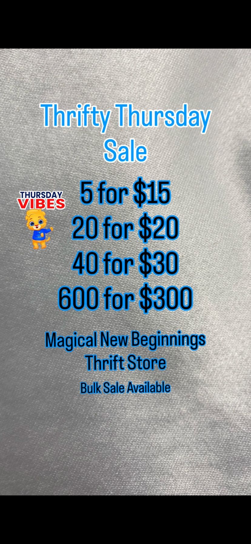 THRIFTY THURSDAY SALE! Come and check out our daily sale THRIFTY THURSDAY. 5 items for $15 20 items for $20 40 items for $30 Magical New Beginnings Thrift Store. The Thrift Store Above! Come visit us and get a great deal. New, Like New and Preloved items updated daily! 514 S. Smith B113 Corona CA TUESDAY- SATURDAY 11am-7pm Some restrictions may apply $9 items and under +tax