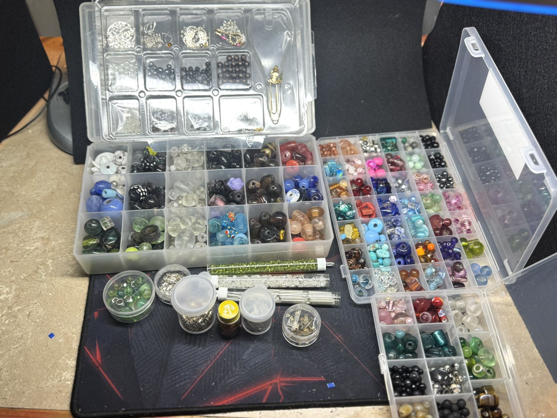 Over 7 lbs of Beads. Glass, Crystal, Ceramic, Stone and Metal. Jewelry making supplies, some tubes of Beads. 3 divided storage containers full