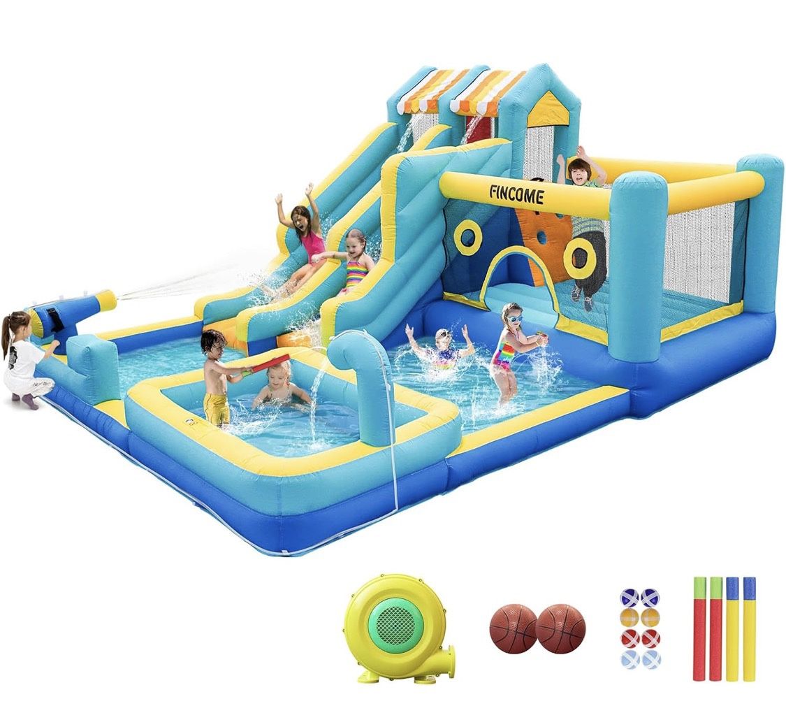 Brand New, never used in box! Retails for $590+ tax!! Only asking $450 In Katy 77493 Perfect for Birthday or BBq’s! 10 IN 1 WATER SLIDE BOUNCE HOUSE】 This inflatable water slide comes with a variety of entertainment zones including double water slides, double sprinklers, jumping area, climbing wall, basketball hoop, water guns, pitching games, and deep pools, which are dedicated to provide more fun and inspire your kids. And our inflatable bounce house comes with a 750w electric blower for quick and easy installation. (The blower needs to be on at all times during use). 【DURABILITY & SAFETY】Safety is always our main concern. This bouncy house has safety nets the jumping area to protect children from bouncing freely and safely. The handrail of the slide has also been raised to improve safety. And it is made of quality 420D+840D Oxford cloth, waterproof, wear-resistant and tear-resistant, we also combine thickened Oxford cloth and double-reinforced sewing technology, which can accommodate multiple children to play together. 【INDOOR & OUTDOOR】This inflatable water slide bounce house can be used both wet and dry, in the hot summer, just connect the water pipe, the bouncy house can be used as a multi-functional children's water slide for kids to enjoy the water fun. On rainy or cold days, you can remove the water pipe and use it as an indoor jumping castle slide. 【KIDS PLAY PARTY】 Your kids can have fun jumping, sliding, shooting and climbing with their friends here. Let the kids share the fun. In addition, water guns and sprinklers will continuously spray cold water to keep the slides and pools wet, so your kids can enjoy the water park even in the hot summer. When the fun is over, you can easily deflate it and store it in the carrying bag. Easy to carry, you can even easily take it to the park, camping and other places to use it. 【EVERYTHING YOU NEED】This bounce house package includes all necessary accessories and detailed instructions. Specifically included: 1 x 750W Air Blower, 1 x Carry Bag, 2 x Inflatable Basketball, 8 x Sticky Ball, 1 x inflator, 4 x Water Gun, 7 x Ground Stakes, 1 x Plastic Hammer, 1 x Water Pipe, Repair Patch. This inflatable water slide is the perfect for every