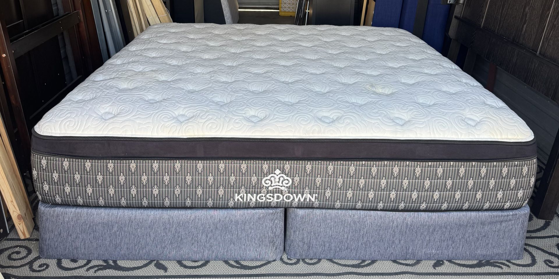 Extremely Comfortable 14” King Size Kingsdown Mattress and boxspring in good condition Medium firm . Very clean Mattress has 2 small spot ( as show in the picture) with little damaged due to a cleaner used to remove a small stain . Smoke and pet free