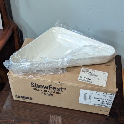 The Cambro 3 qt. Triangular Serving Tray - ShowFest [SFT1212-148] is a stylish tray for serving food. It can be used for just about anything edible and provides an artistic presentation. In addition to looking great, the tray is also very sturdy and will last a long time. Comes in a set of 6. Brand Name You Can Trust √ Light Weight and Easy to Use √ Heavy Duty for Commercial Use √ Sleek and Easy to Use Design √ Sturdy Construction Great for parties or Catering Check my other items 🤷♀️