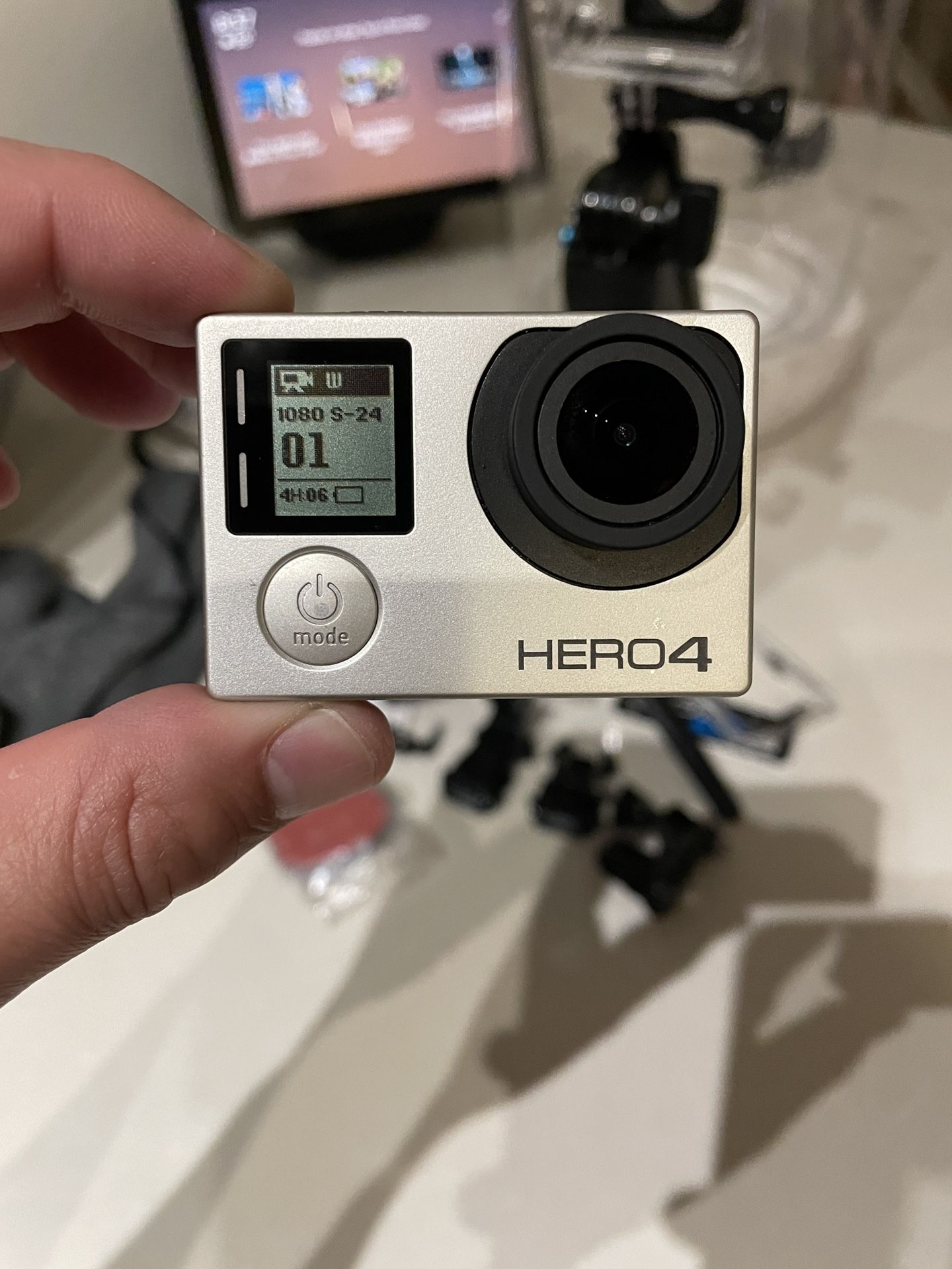 Selling my GoPro Hero4 Silver. Retails on Amazon for more than $400. Including accessories you see in the pic that did not come with the GoPro standalone. Including a: 1. hand stick that also serves as a stand. 2. Plastic case that serves as a cover to submerge the go pro under water 3. Different mount types if you want to mount to car or motorcycle helmet. 4. 64gb Micro SD card