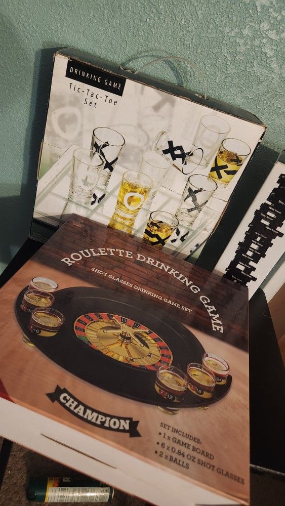 3 drinking games: Shot tic tac toe Tipsy tower Roulette (missing 2x balls) Used a few times and hasn't been touch since. All in great condition. Take all for $5