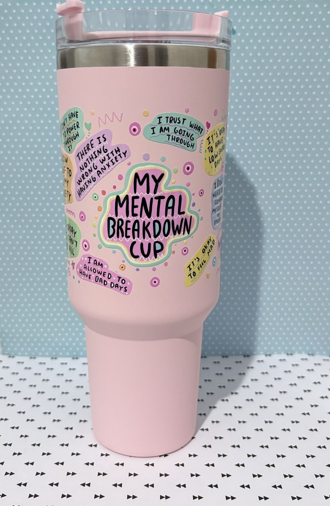 Baby pink stainless steel mental health cup. Made with custom uvdt wrap. Hand wash only.