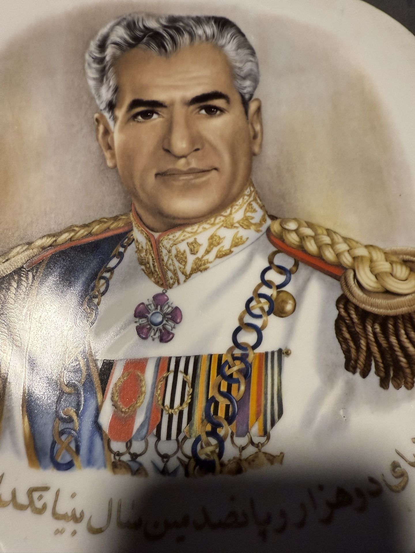 This Mohammad Reza Shah Pahlavi and Sarah Farah Pahlavi Vintage Collectors Plate Set by Suisse Langenthal is a luxurious and historically significant collector's item. Crafted by the renowned Swiss porcelain maker, Suisse Langenthal, the set features elegantly detailed portraits of the Iranian royal couple, Mohammad Reza Shah and Empress Farah Pahlavi. Known for its superior craftsmanship, the set showcases intricate hand-painted designs with rich, vibrant colors, capturing the regal elegance and refinement of the Pahlavi era. The plates are made from fine porcelain with gold trim, offering both durability and delicate beauty. The high-quality materials and expert artistry reflect the opulence of the royal court during the 1960s and 1970s. This set is a tribute to the royal family’s legacy, perfect for collectors of royal memorabilia or enthusiasts of vintage Persian collectibles. Whether displayed as a showpiece or used for special occasions, this plate set embodies the historical and cultural significance of Iran’s Pahlavi dynasty, making it a rare and prestigious addition to any collection.