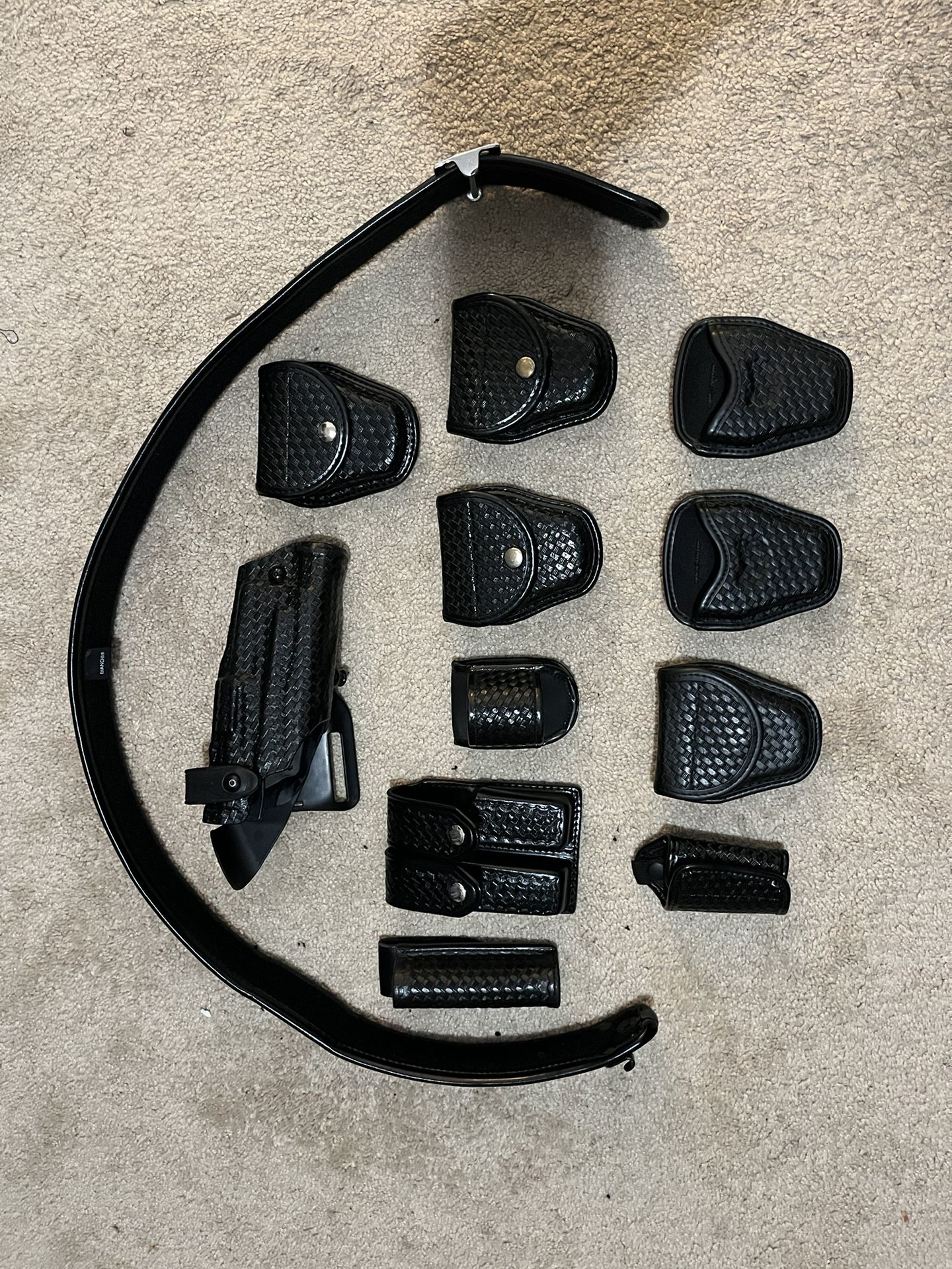 Everything is basketweave, hit me up for prices on individual items Glock 17/22 holster for tlr 1 Bianchi belt size 40-42(silver buckle) Glock 17/22 mag holster(silver)(brand new) 2 open top cuff cases(brand new) 3 bianchi cuff cases(silver) 1 is brand new, other two are used 1 bianchi hidden snap cuff case(brand new) silent key holder Baton holder for ASP baton Large flashlight holster(streamlight stinger)