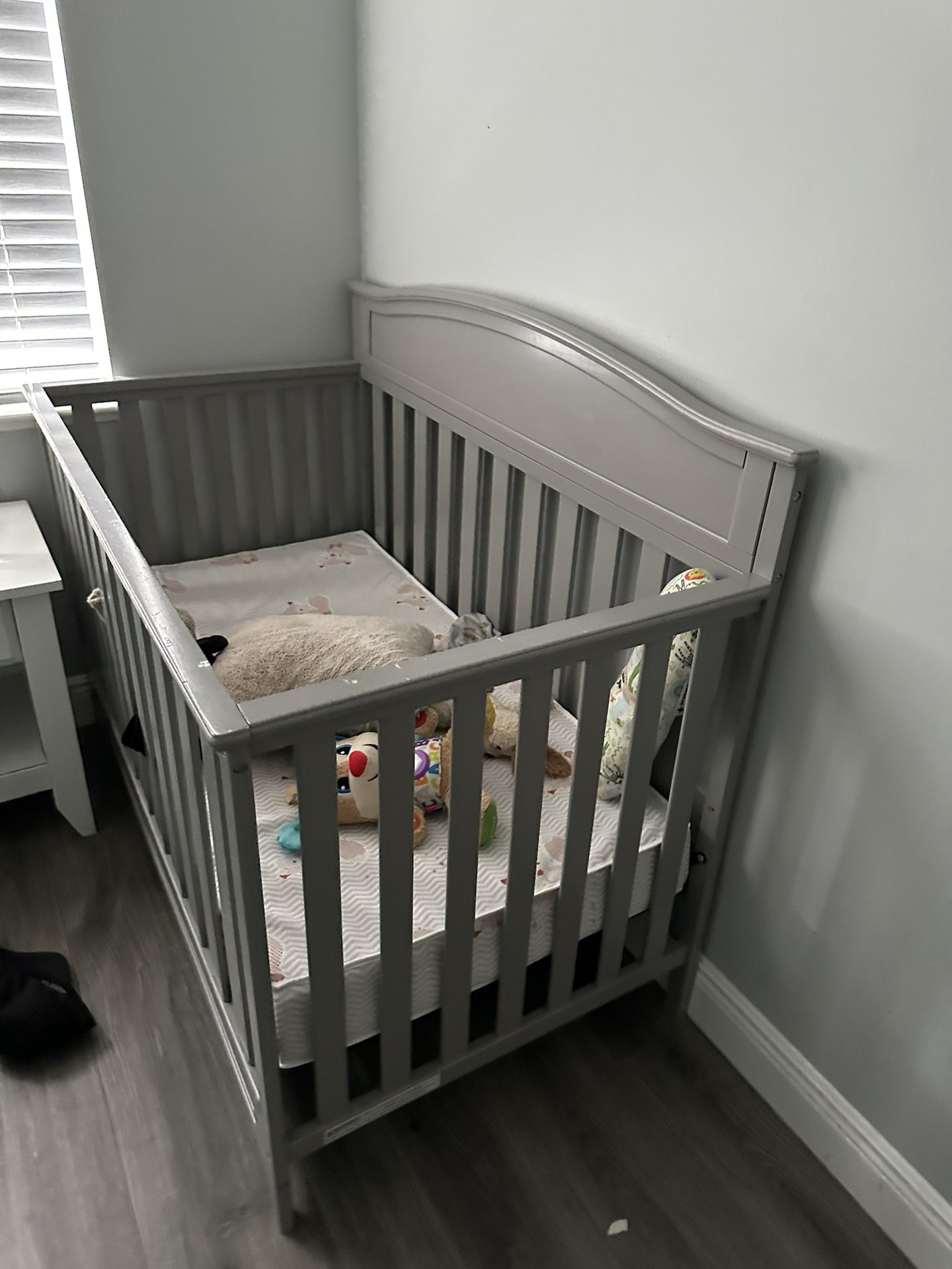 Grey crib, mattress and changing table . Wood and high quality . My son barely ever slept on the mattress, doesn’t need to be purchased with the set . Crib has few defects from teething but otherwise perfect . Changing table is perfect