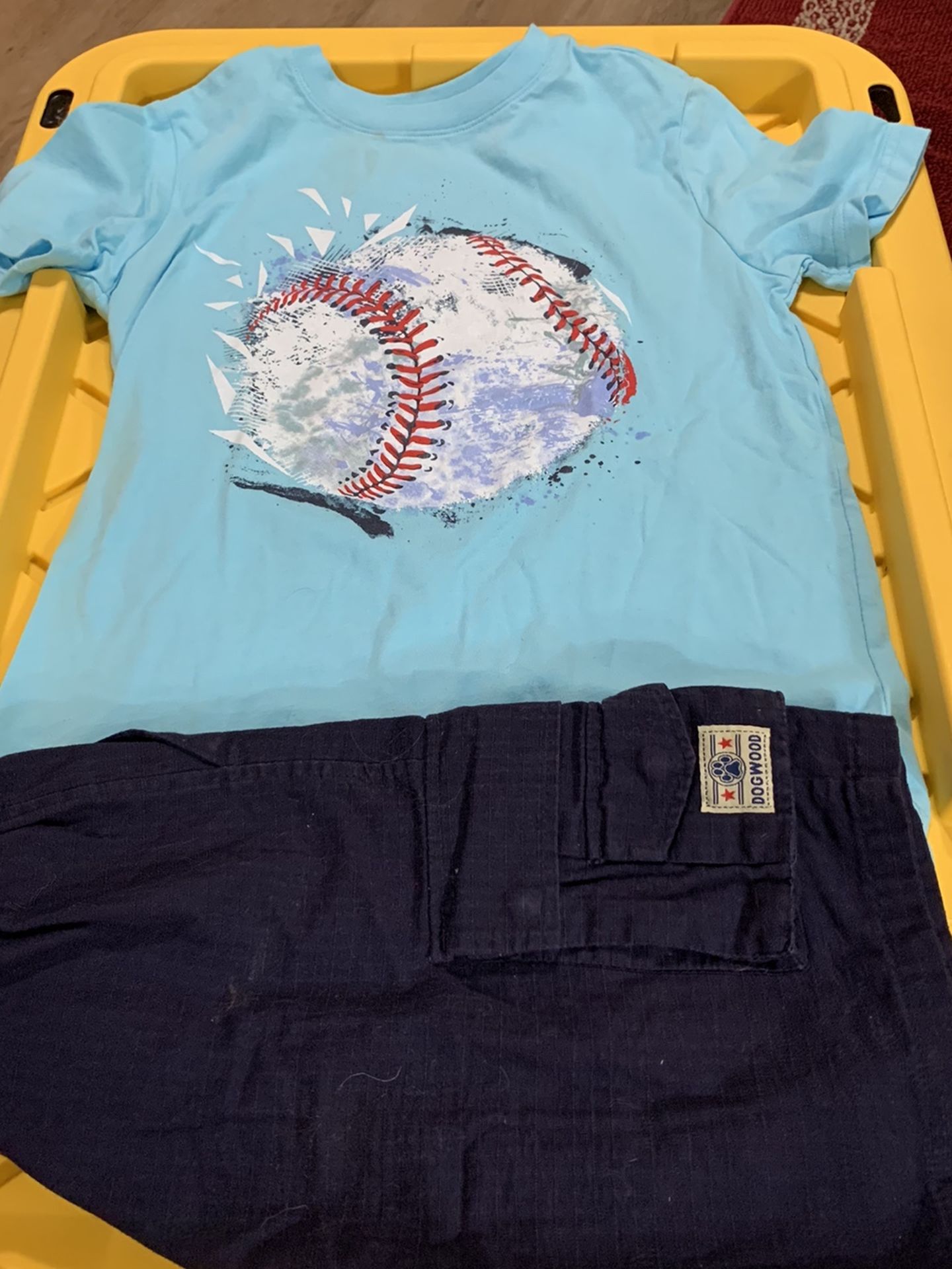 This is a cat and Jack T-shirt 8/10 and a pair of blue shorts size 8 elastic waist
