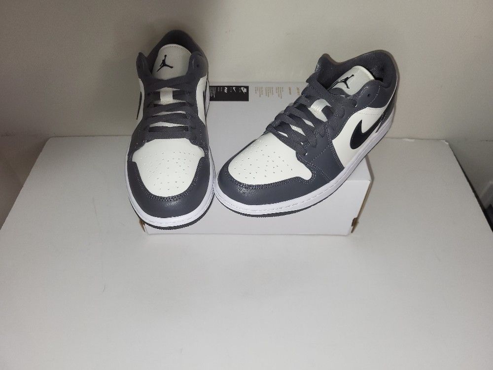 Jordan 1 Low Retro Sail/Dark Grey/White colorway.