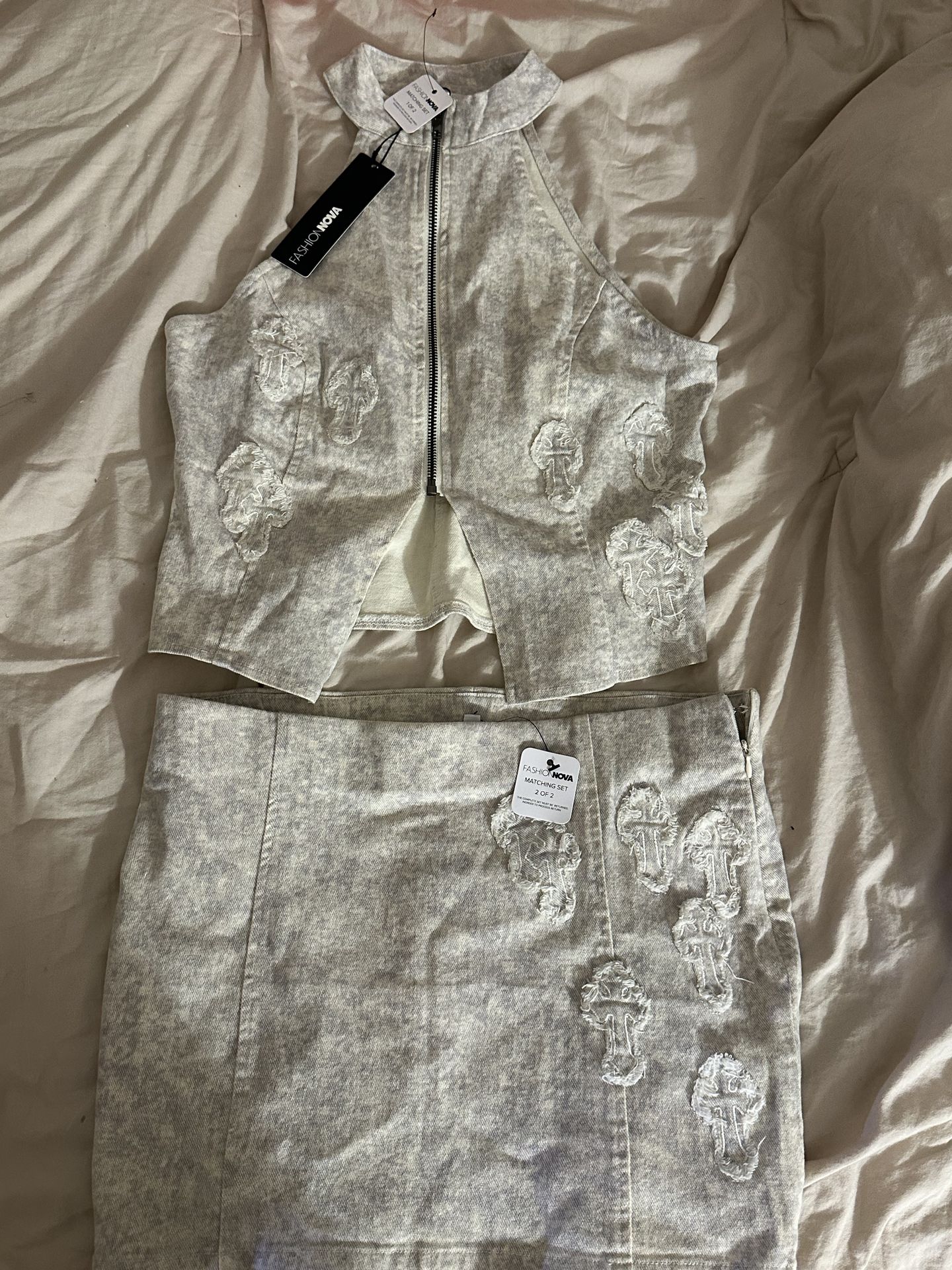Brand new Fashion Nova matching set, never been worn and still has the original tags. Includes a corset-style crop top with a front zipper and a matching mini skirt. The set has a light grey acid-wash look with distressed cross detailing that gives it a unique edgy style. Perfect outfit for going out, events, or styling together or separately with other pieces.