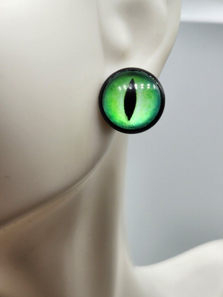 Set of green cats eye earrings set on black studs. Made with hypoallergenic materials