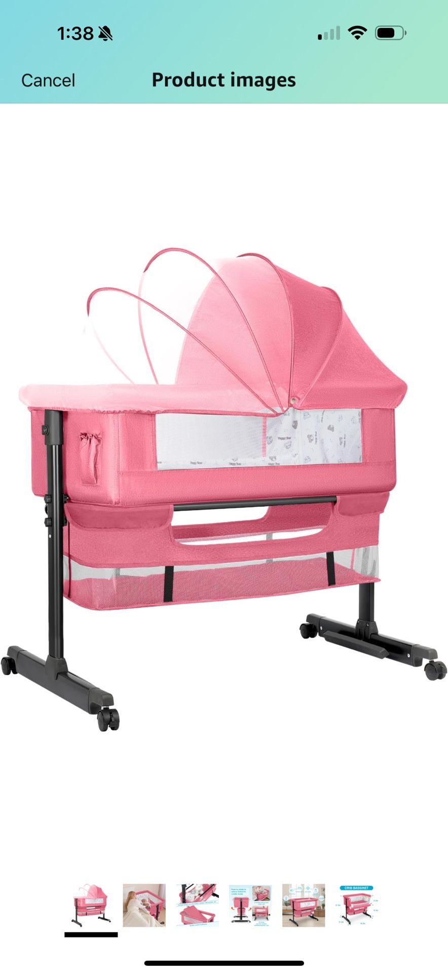 Pink baby bassinet, adjustable sides, rocking motion bedside co sleeping safety easy to fold portable quick clean, soft mattress convenient for breast-feeding, storage at bottom , excellent condition, no stains no rips no problems , I have two bassinet fitted sheets I will also give with it 31.5 inch tall , 34.2 inch long, 21.6 inch wide ,