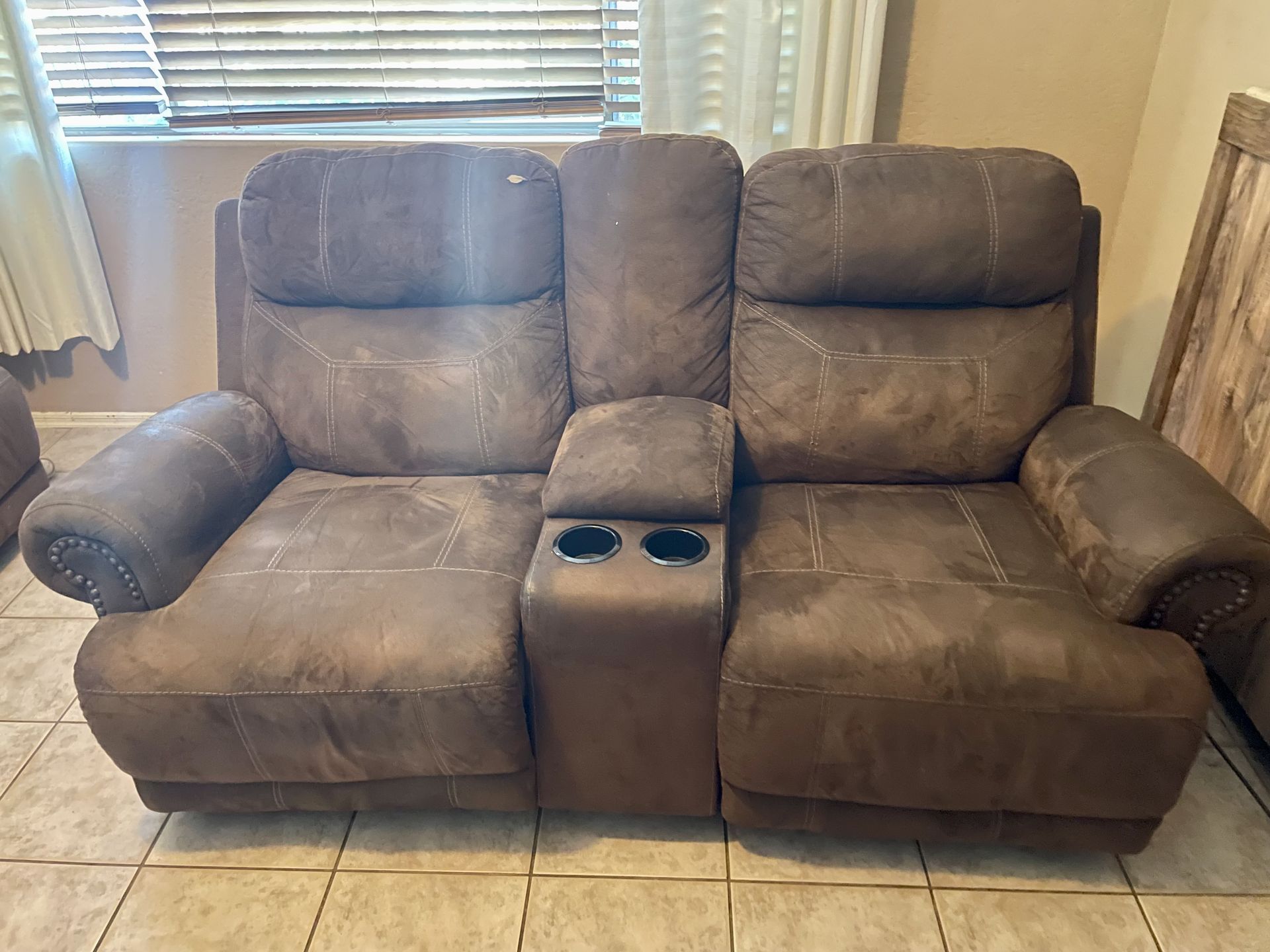 Brown microfiber couch, both sides recline. Small rip on top left.