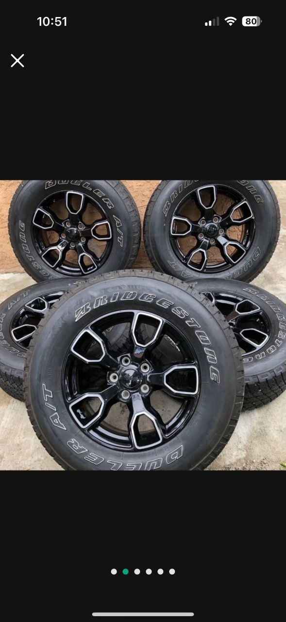 Jeep Wrangler wheels and tires mountain special edition . 18” wheels excellent condition tires are Bridgestone around 70-75% life . It’s a set of 5 wheels and tires spare tire never been used no tpms fit any Jeep rubicon , Sahara etc serious buyers only please don’t wasted my time not in a rush to sell . Asking $600 firm cash