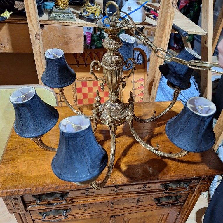 Vintage or traditional-style brass chandelier with five arms and black shades. This style of lighting combines classic elegance with a bold contrast, making it a versatile choice for a variety of interior designs, from modern to traditional. Finish: The frame is a warm antique or polished, brass. Design: It features five gracefully curved arms and a detailed central column. Shades: It is fitted with black fabric shades. The black and brass combination is currently a popular design choice. SEE MEASUREMENTS. Porch pickup. (ATT).